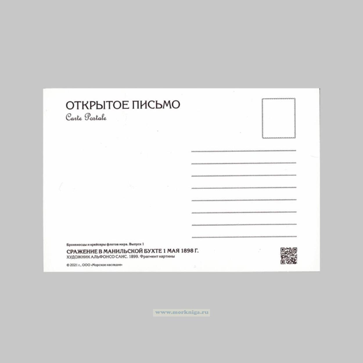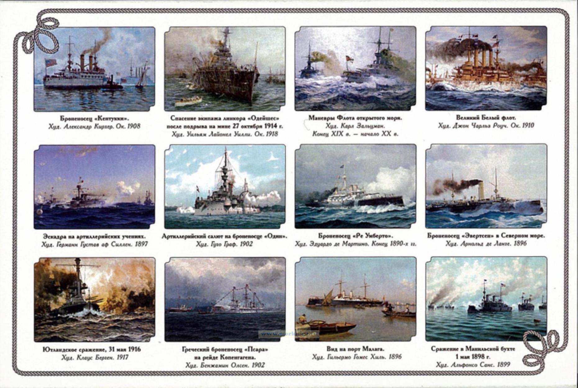 В наборе открыток представлены репродукции картин с изображением кораблей основных классов иностранных флотов, построенных в конце XIX - начале XX века.