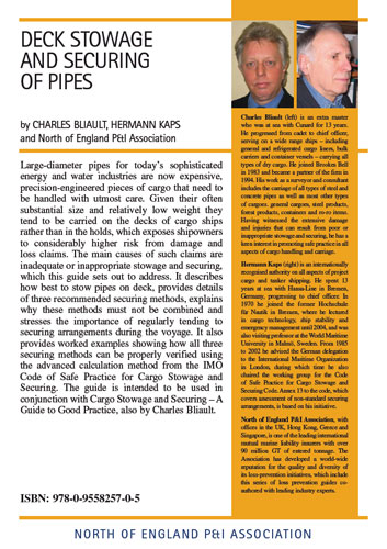 There have been a number of losses or part losses over the last few years of blocks of pipes stowed on deck, principally on the hatch covers. Much consideration has been given to the reasons for those losses and ways by which such stowages may be adequately secured for the rigours of an ocean voyage.