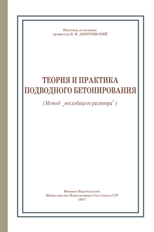 Монография профессора В. И. Дмитревского "Подводное бетонирование"посвящена рассмотрению способов возведения сооружений из бетона с применением водолазного труда и, в частности, по подводному бетонированию методом "восходящего раствора". В монографии приводится история вопроса, дается анализ различных приемов подводного бетонирования и сообщаются примеры' решения задач капитального восстановления подводным бетонированием сооружений военно-морских баз в период Великой отечественной войны.