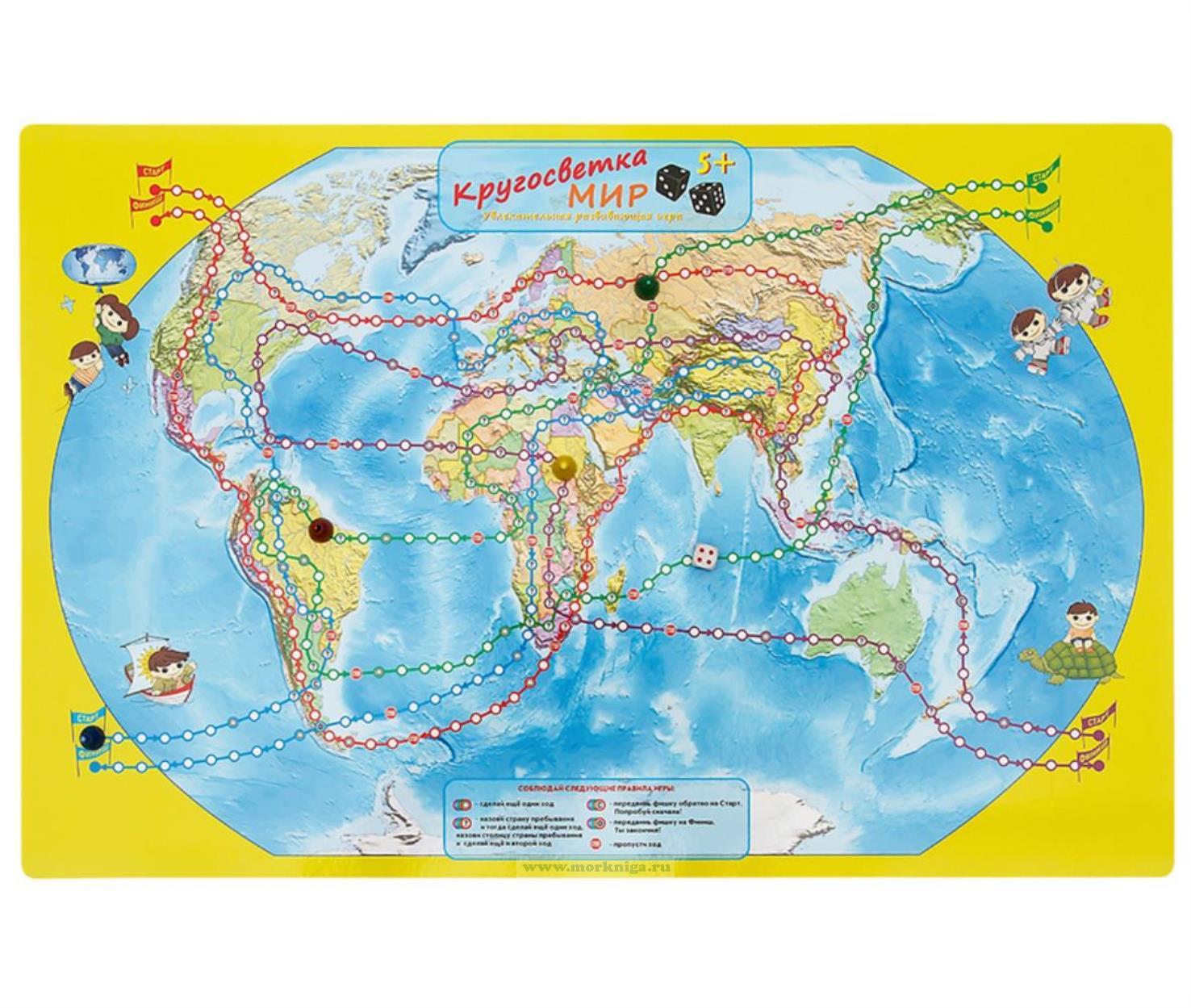 Карта-игра двухсторонняя, с одной стороны увлекательная соревновательная игра-ходилка "Кругосветка", помогает деткам тренировать внимание, память и быстро выучить названия стран и их столицы. Кинь игральный кубик, сделай ход и выполни условия игры: назови страну пребывания, или вернись на старт, или следуй на финиш, или пропусти ход. Подсказки можно найти на обороте игрового поля. Игра станет отличным проведение досуга всей семьи. Со второй стороны расположена политическая карта мира, на которой отражены страны и их столицы, крупнейшие города. В комплекте с картами-играми идет кубик и 4 фишки.
