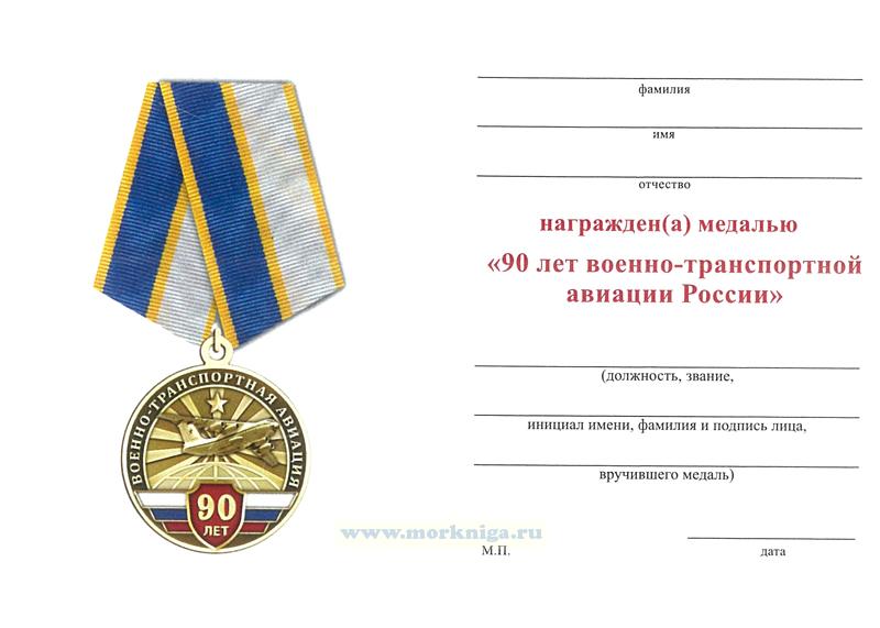 Медаль "90 лет военно-транспортной авиации (ВТА)" продается с незаполненным бланком удостоверения