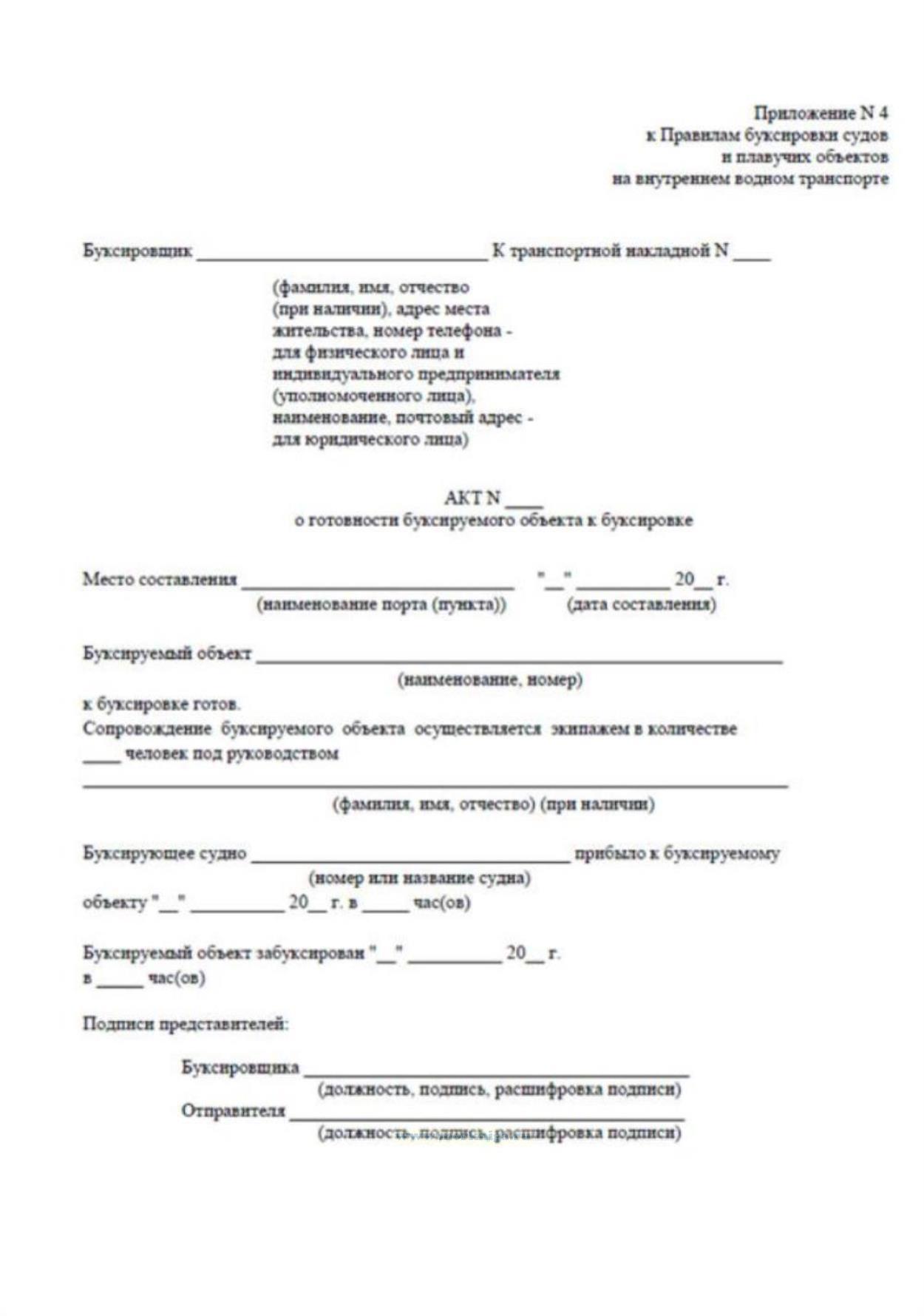Форма акта соответствует Приложению 4 к Приказу Минтранса России от 28.08.2020 N 339 "Об утверждении Правил буксировки судов и плавучих объектов на внутреннем водном транспорте"