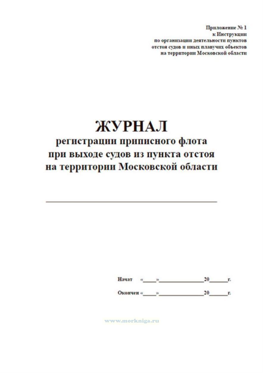 Форма журнала регистрации приписного флота регистрации приписного флота соответствует Приложению № 1 к Распоряжению Министра транспорта Правительства МО от 11.02.2002 N 2а "Об утверждении Инструкции по организации деятельности пунктов отстоя судов и иных плавучих объектов на территории Московской области", которое утратило силу.