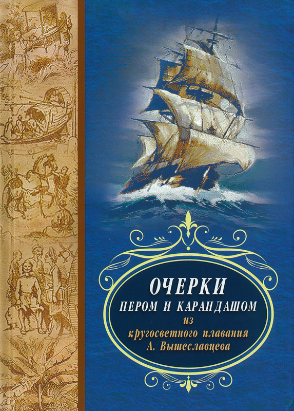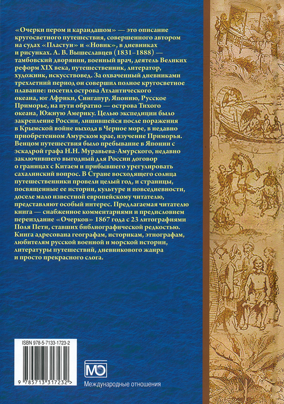 «Очерки пером и карандашом» представляют собой снабженное комментариями и предисловием переиздание книги 1867 года с 23 литографиями Поля Пети, ставшей библиографической редкостью. Это описание кругосветного путешествия, совершенного автором на судах «Пластун» и «Новик», в дневниках и рисунках. А. В. Вышеславцев (1831-1888) - тамбовский дворянин, военный врач, деятель Великих реформ XIX века, путешественник, литератор, художник, искусствовед. За три года он совершил полное кругосветное плавание: посетил острова Атлантического океана, Юг Африки, Сингапур, Японию, Русское Приморье, на пути обратно - острова Тихого океана, Южную Америку. Целью экспедиции было закрепление России, лишившейся после поражения в Крымской войне выхода в Черное море, в недавно приобретенном Амурском крае, изучение Приморья. Венцом путешествия было пребывание в Японии с эскадрой графа Н. Н. Муравьева-Амурского, недавно заключившего выгодный для России договор о границах с Китаем и прибывшего урегулировать сахалинский вопрос. В Стране восходящего солнца путешественники провели целый год, и страницы, посвященные ее истории, культуре и повседневности, доселе мало известной европейскому читателю, представляют особый интерес.