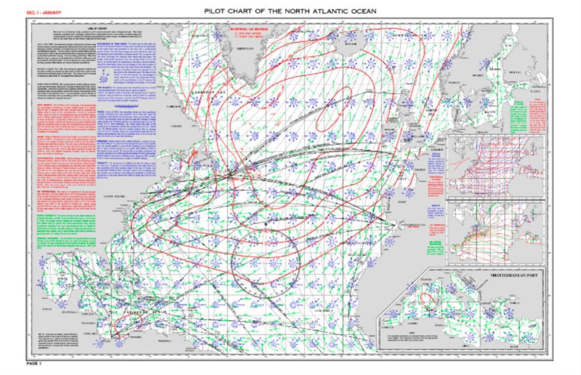 Pilot Charts depict averages in prevailing winds and currents, air and sea temperatures, wave heights, ice limits, visibility, barometric pressure, and weather conditions at different times of the year. The information used to compile these averages was obtained from oceanographic and meteorologic observations over many decades during the late 18th and 19th centuries.