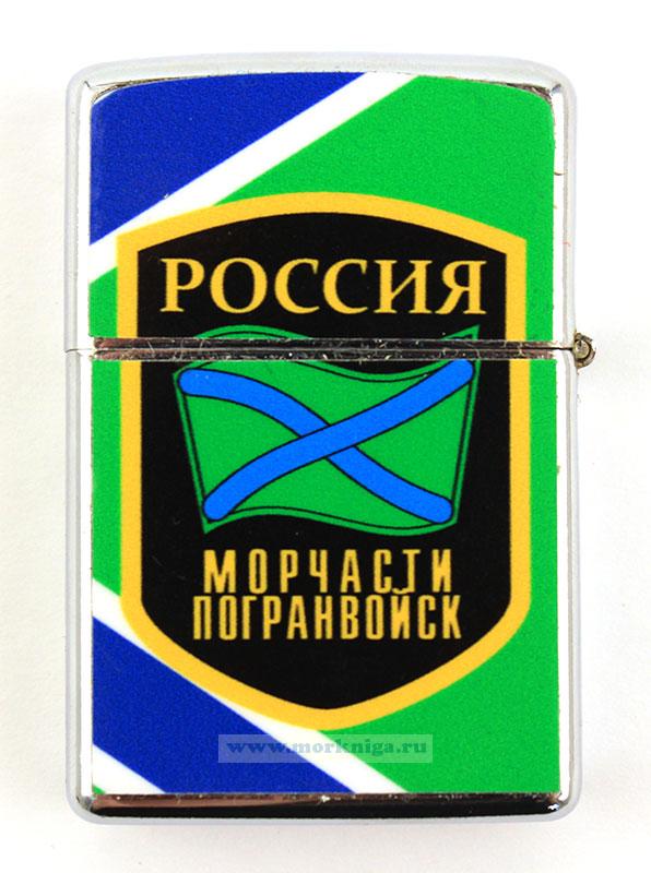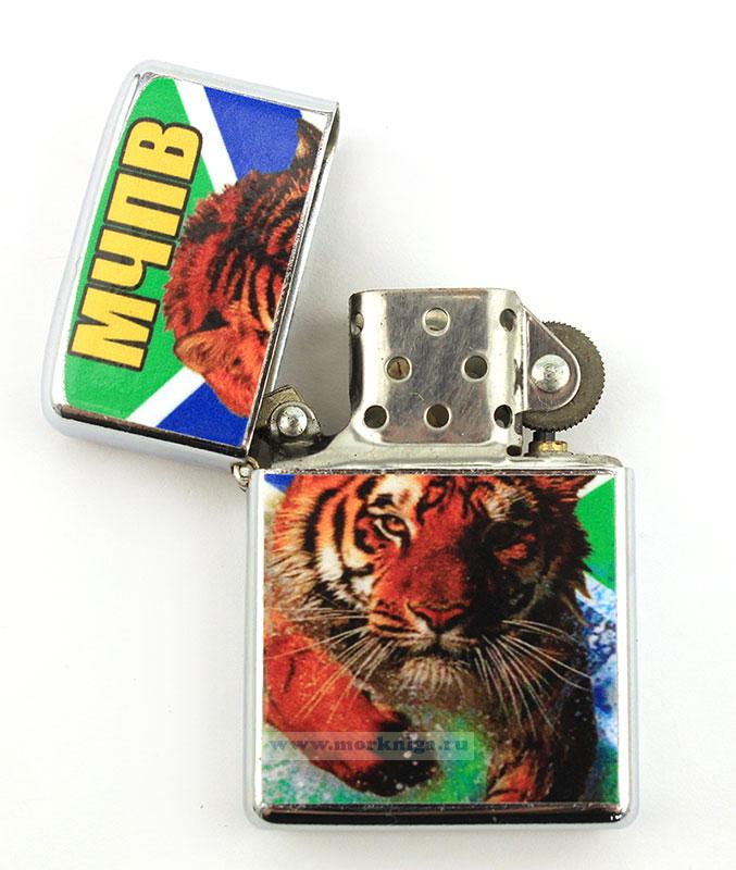 Бензиновая зажигалка серебряного цвета. На лицевой части изображен тигр, сверху надпись «МЧПВ». На обратной стороне герб морчасти погранвойск и надпись «Морчасти погранвойск. Россия».