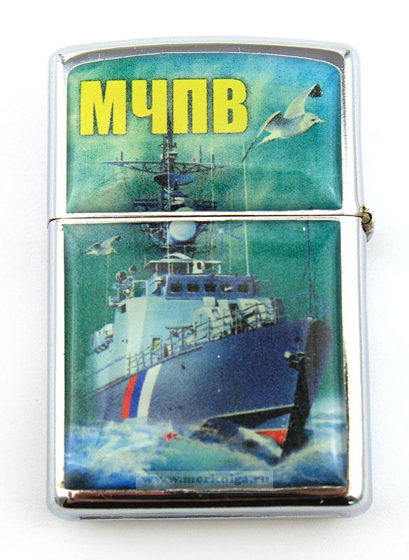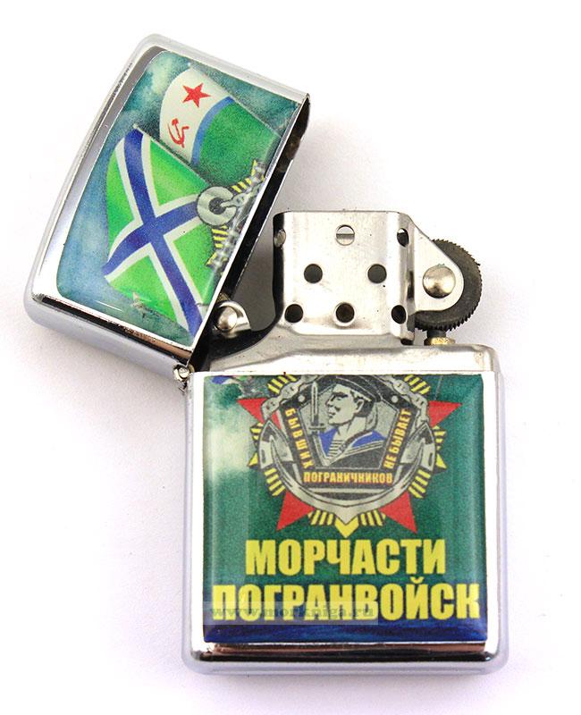 Бензиновая зажигалка серебряного цвета. На лицевую часть нанесено изображение знака "Бывших пограничников не бывает" и флаги погранвойск, снизу надпись "Морчасти погранвойск". На обратной стороне изображен корабль, сверху надпись "МЧПВ".