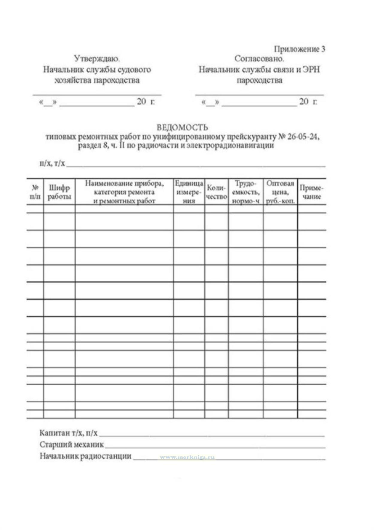 Форма Ведомости типовых ремонтных работ по унифицированному прейскуранту № 26-05-24, раздел 8, ч. II по радиочасти и электрорадионавигации соответствует Приложению 3 к РД 31.65.06-85 "Правила технической эксплуатации средств радиосвязи на судах".
