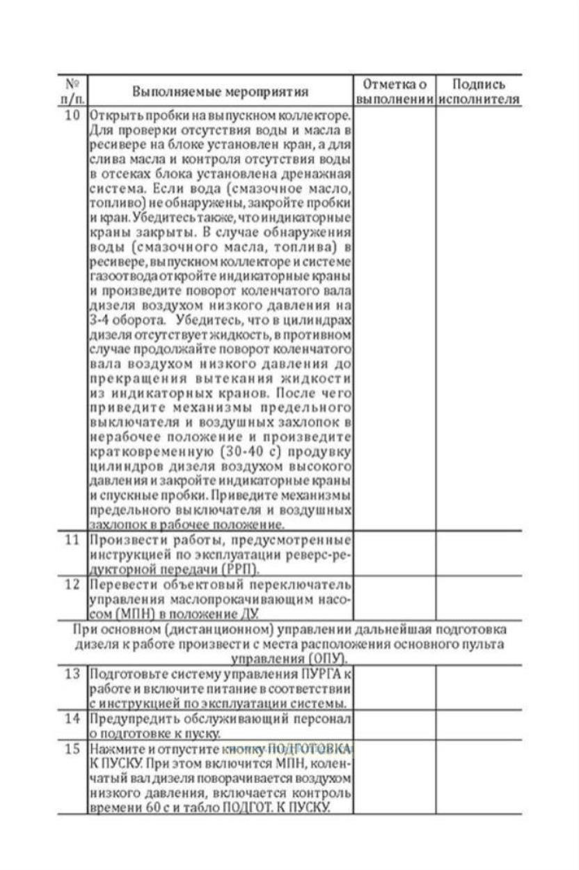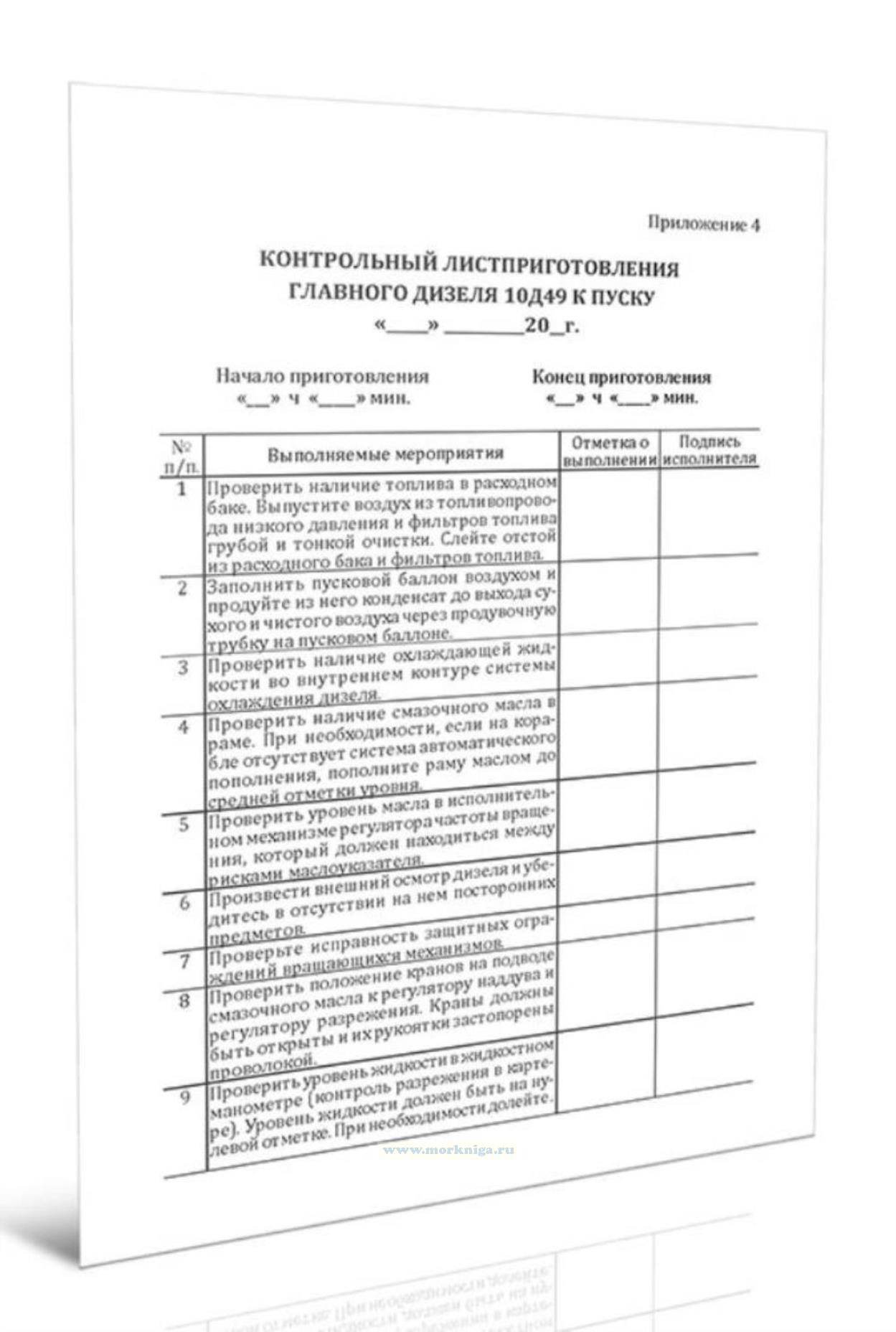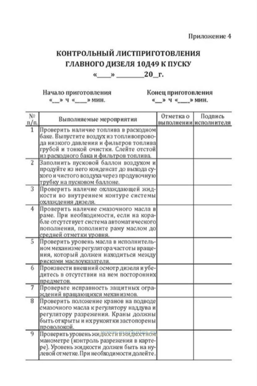 Форма Контрольного листа приготовления главного дизеля 10Д49 к пуску соответствует Приложению 4 к ПЭД-НК-2009 "Правила эксплуатации дизелей надводных кораблей ВМФ"