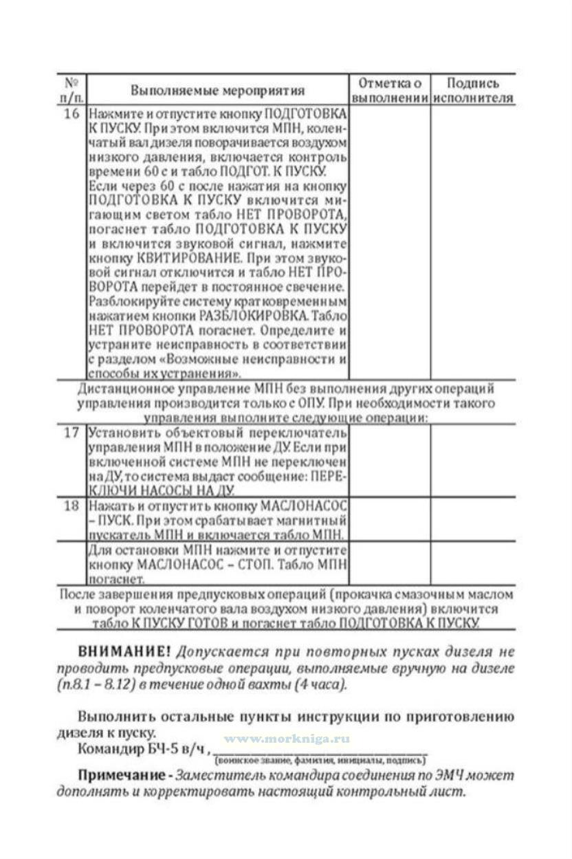 Личный состав должен вести постоянное наблюдение за работой дизеля, систем и механизмов по показаниям контрольно- измерительных приборов и сигнализации, а также путем осмотра и прослушивания дизеля и обслуживать дизель в строгом соответствии с руководством по эксплуатации.