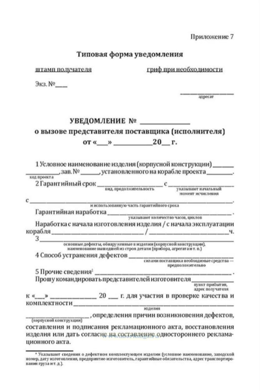 Форма Уведомления о вызове представителя поставщика (исполнителя) соответствует Приложению 7 к ПЭД-НК-2009 "Правила эксплуатации дизелей надводных кораблей ВМФ"