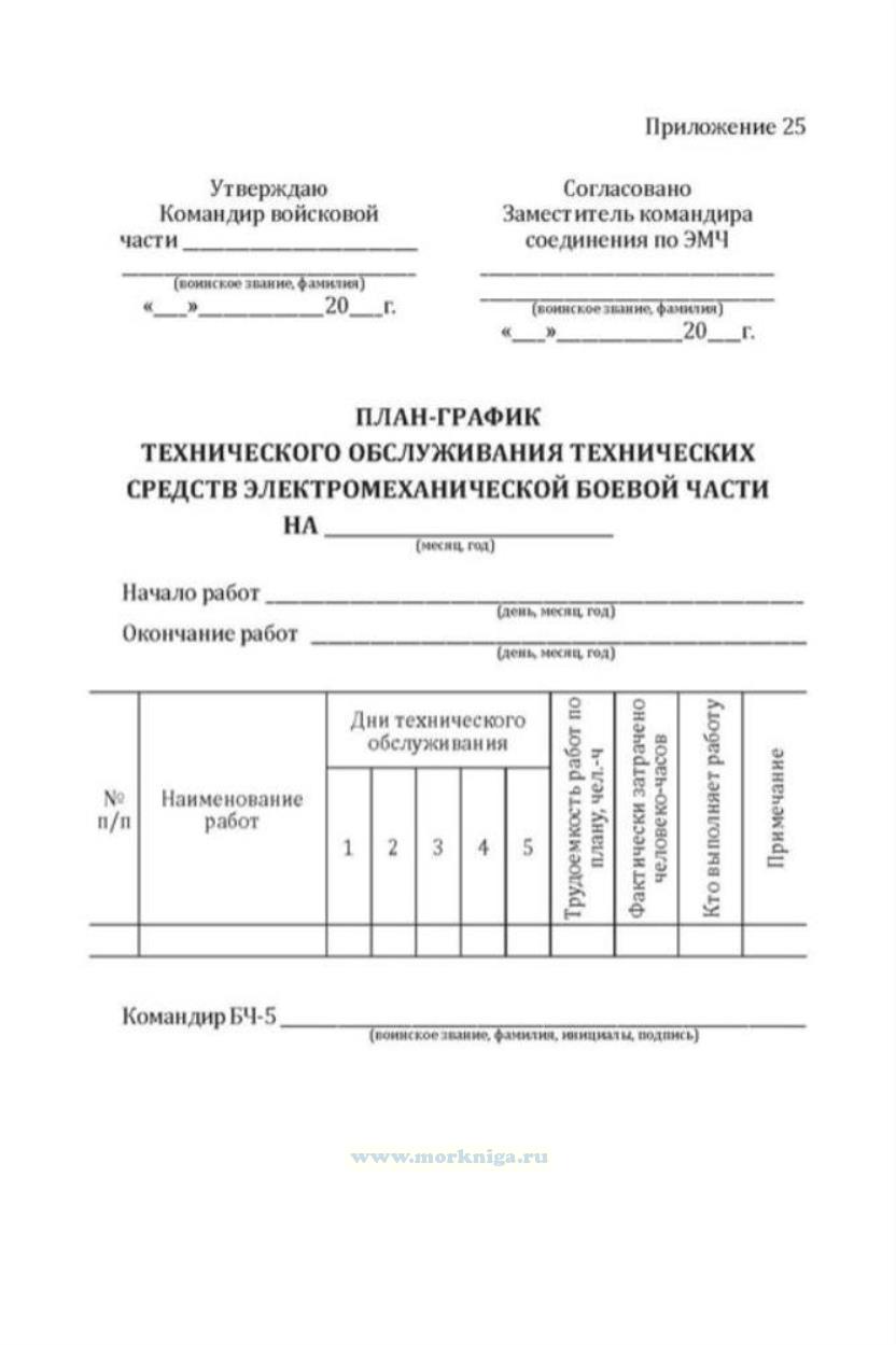 Форма Плана-графика технического обслуживания технических средств электромеханической боевой части на месяц соответствует Приложению 25 к ПЭД-НК-2009 "Правила эксплуатации дизелей надводных кораблей ВМФ"