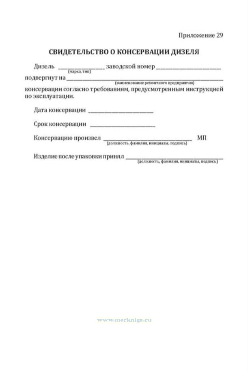 Форма Свидетельства о консервации дизеля соответствует Приложению 29 к ПЭД-НК-2009 "Правила эксплуатации дизелей надводных кораблей ВМФ"