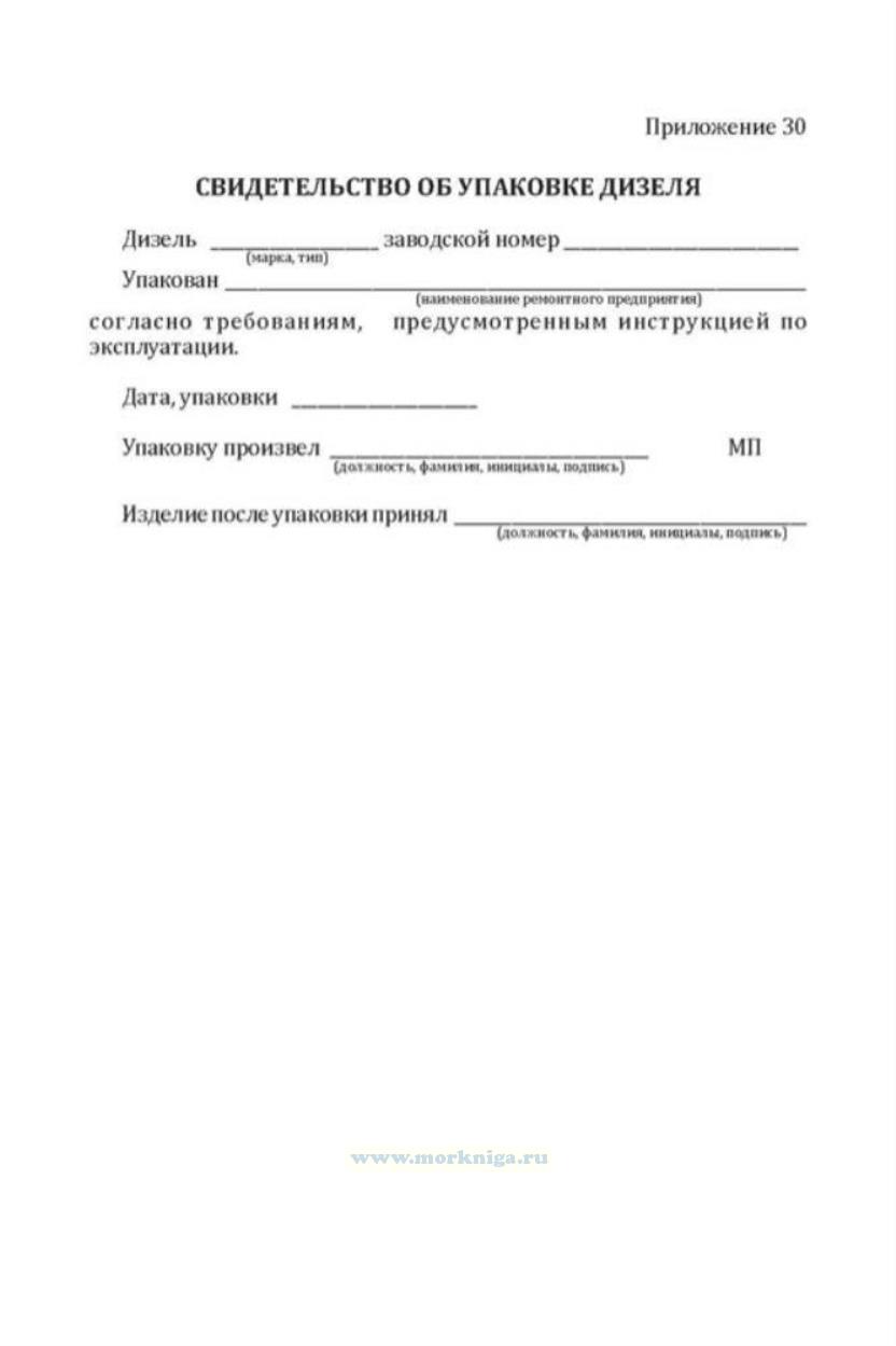 Форма Свидетельства об упаковке дизеля соответствует Приложению 30 к ПЭД-НК-2009 "Правила эксплуатации дизелей надводных кораблей ВМФ"