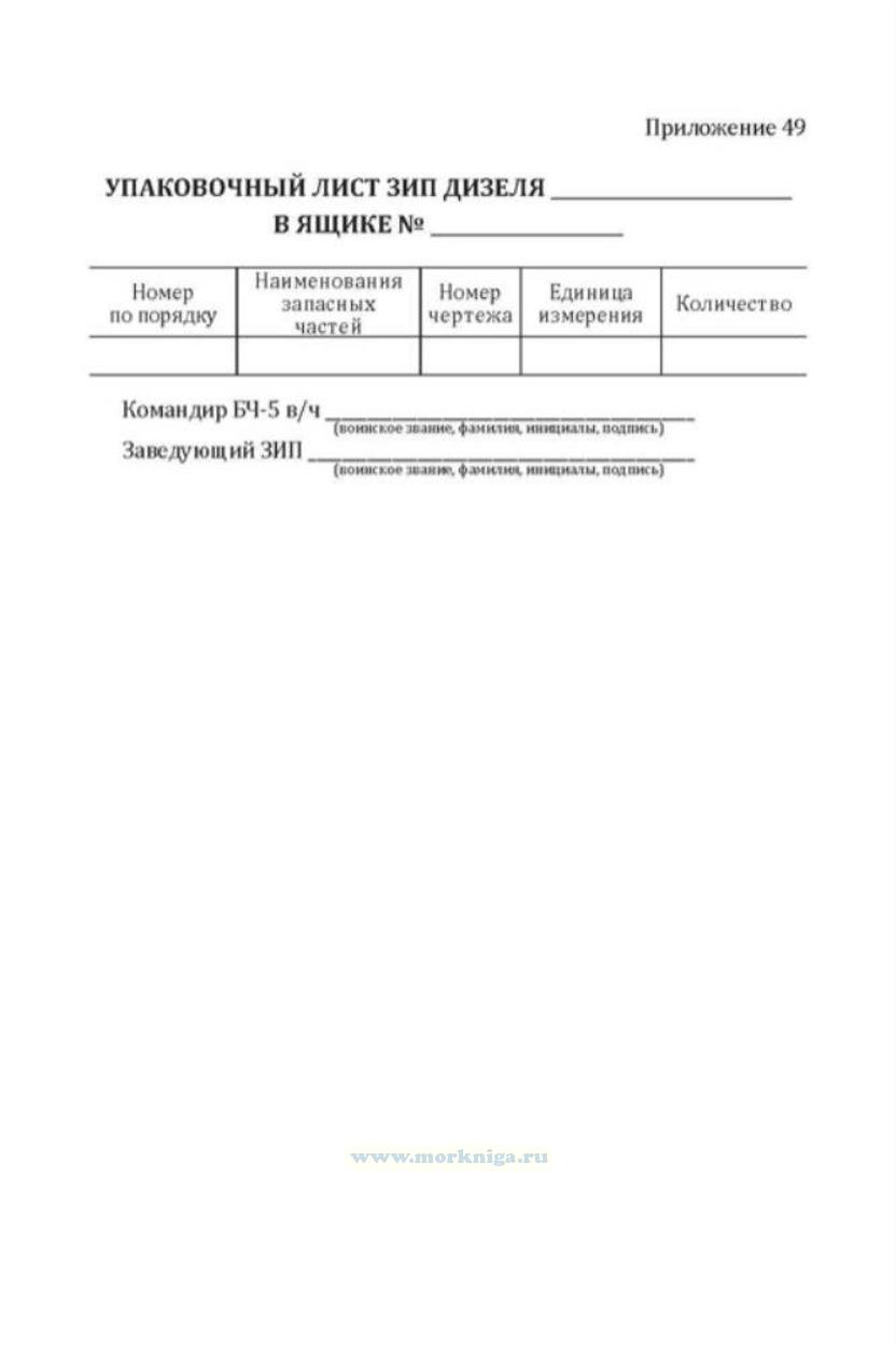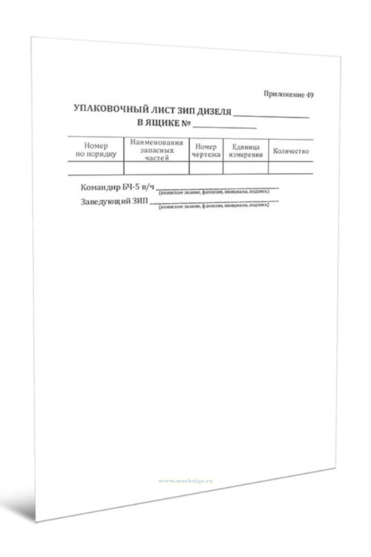 Форма Упаковочного листа ЗИП дизеля соответствует Приложению 49 к ПЭД-НК-2009 "Правила эксплуатации дизелей надводных кораблей ВМФ"