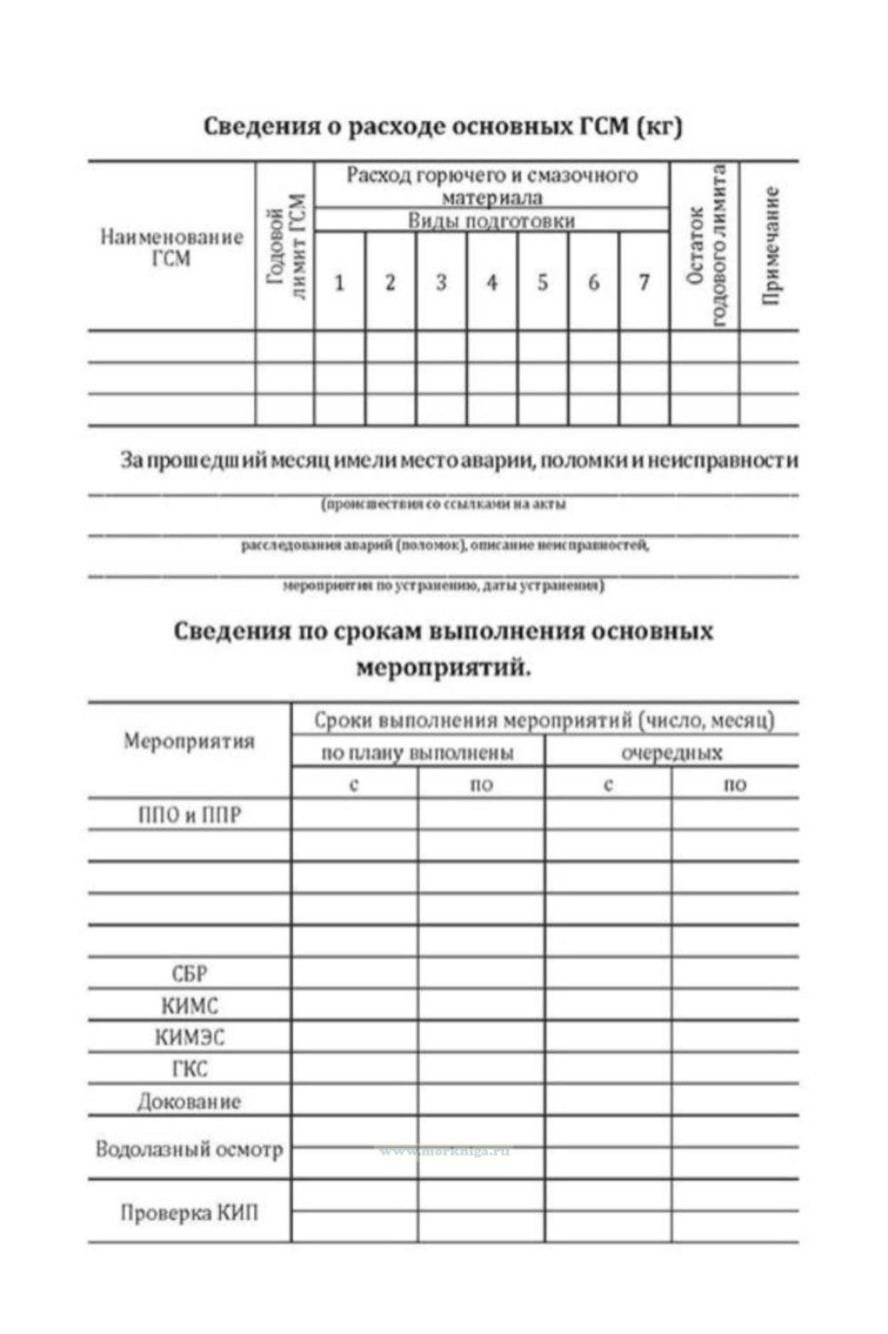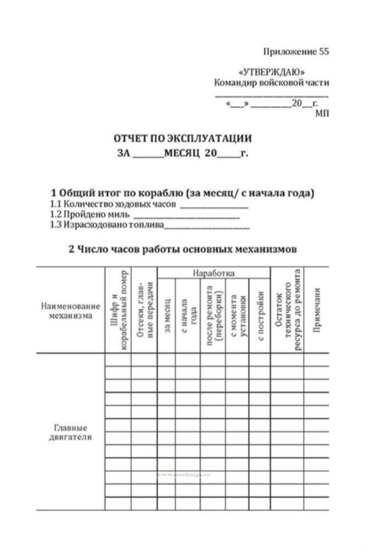 Форма Отчета по эксплуатации за месяц соответствует Приложению 55 к ПЭД-НК-2009 "Правила эксплуатации дизелей надводных кораблей ВМФ" Для периодической отчетности ежемесячно составляется Отчет по эксплуатации корабля.