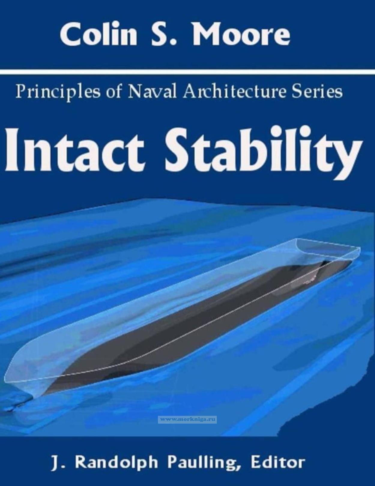 In this new edition of PNA, the principles of intact stability in calm water are developed starting from initial stability at small angles of heel then proceeding to large angles. Various effects on the stability are discussed such as changes in hull geometry, changes in weight distribution, suspended weights, partial support due to grounding or drydocking, and free liquid surfaces in tanks or other internal spaces. The concept of dynamic stability is introduced starting from the ship's response to an impulsive heeling moment. The effects of waves on resistance to capsize are discussed noting that, in some cases, the wave effect may result in diminished stability and dangerous dynamic effects.