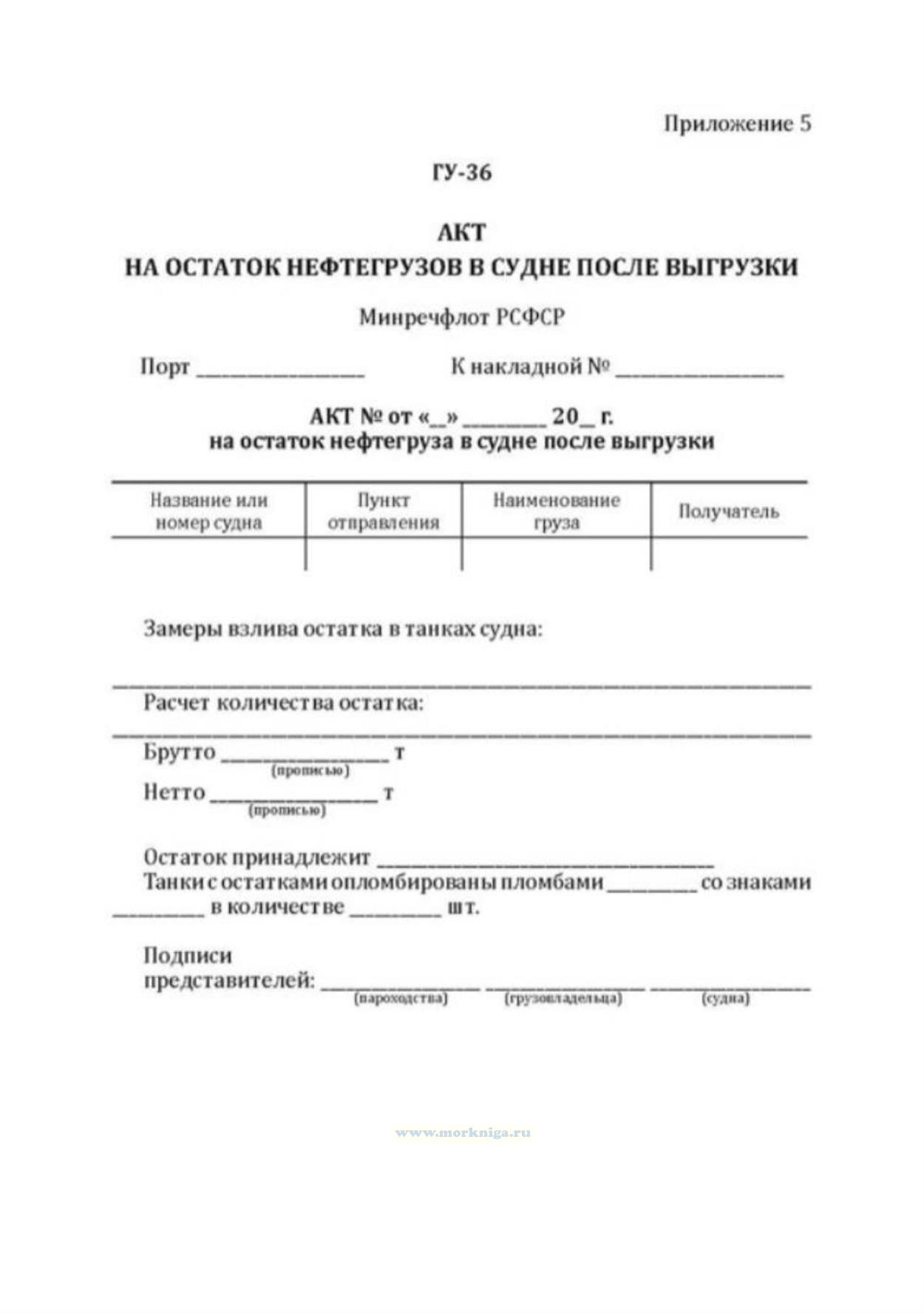 Форма Акта на остаток нефтегрузов в судне после выгрузки (Форма ГУ-36) соответствует Приложению 5 к Правилам перевозок грузов. Часть 2 утв. Минречфлотом РСФСР.