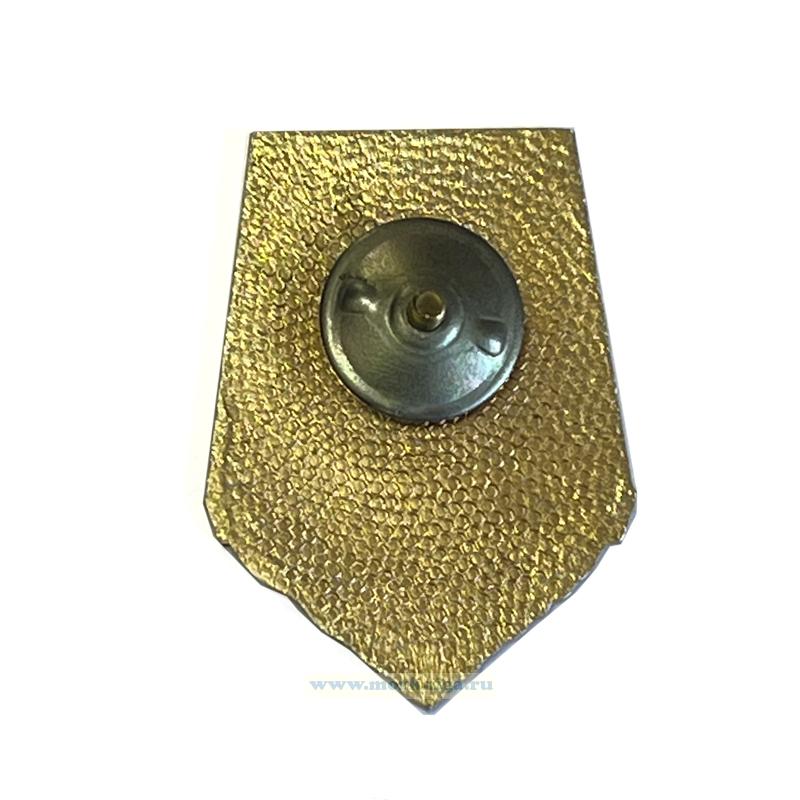Под ней треугольник, образованный нижними боковыми сторонами щита, оформлен в виде синего воротника форменной рубахи рядового состава флота с тремя белыми полосками. Посередине находится красный щиток, обрамленный золотистым буртиком с золотистым якорем.