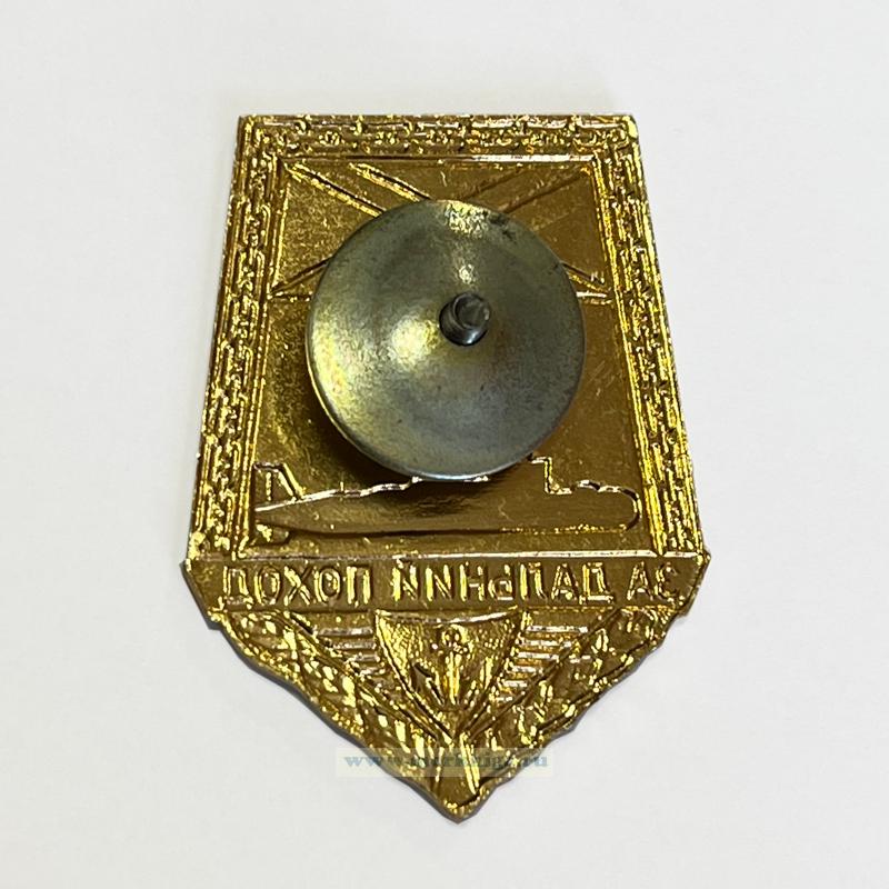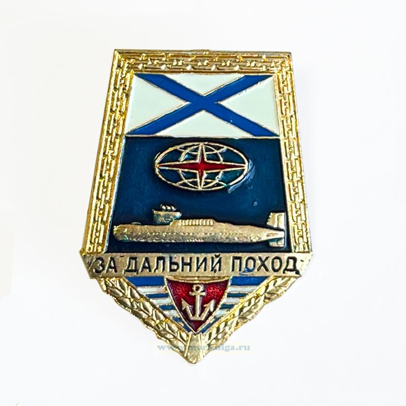 Пятиугольный щит, окаймленный наверху и по бокам золотистой полосой, низ обрамлен золотистыми листьями. Внутреннюю верхнюю часть щита занимает Андреевский флаг. На средней части под флагом находится стилизованное изображение земного шара в виде золотистой сетки меридианов и параллелей с наложенными на него главными румбами компаса красного цвета. Под ним размещен силуэт подводной лодки. Еще ниже находится поперечная полоса золотистого цвета с черной надписью: "За дальний поход".