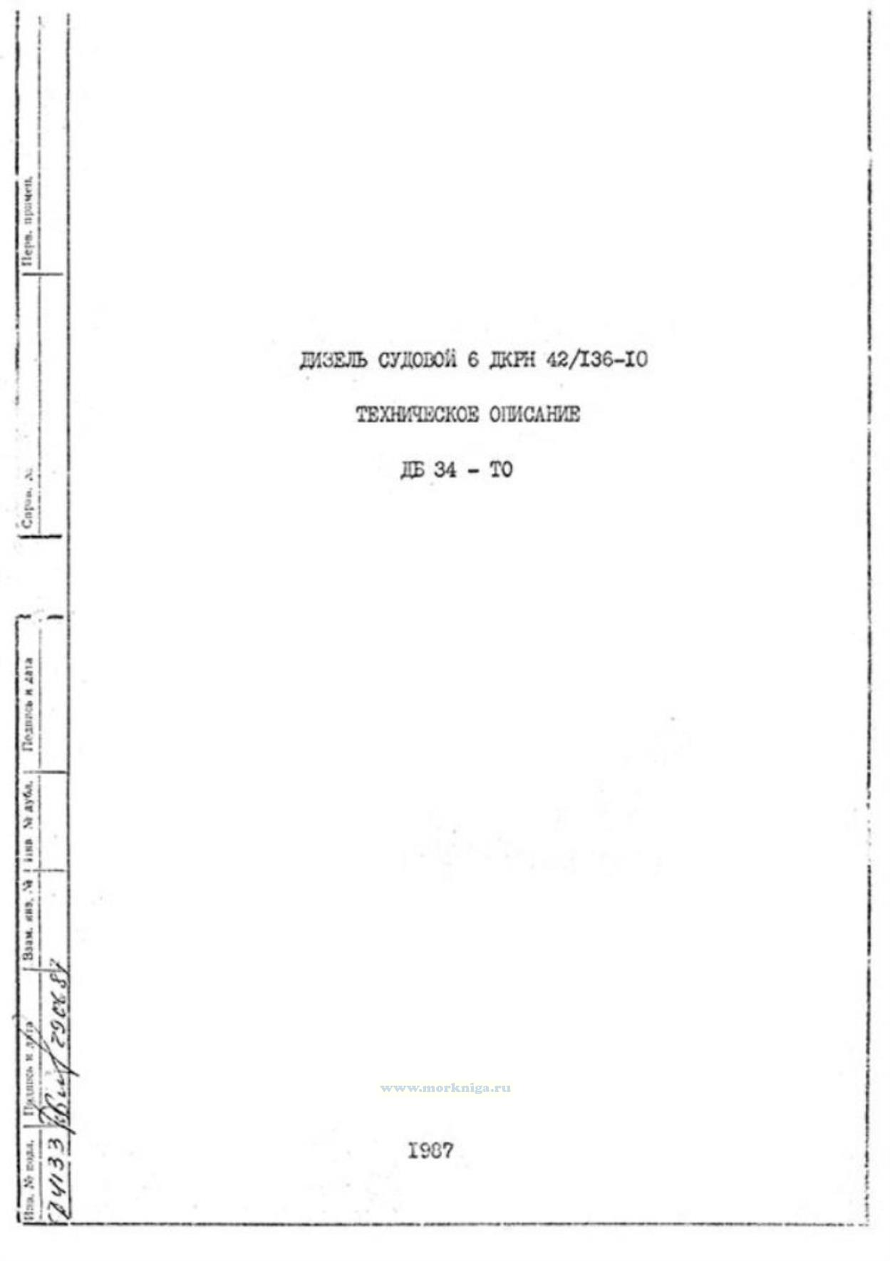 В настоящей инструкции дано техническое описание судовых дизелей правой модели типа 6ДКРН 42/136 (заводское обозначение ДБ34) и левой модели типа 6ДКРН 42/136Л (заводское обозначение ДБ35), изготовляемых производственным объединением Брянский машиностроительный завод им. В.И. Ленина (ПО БМЗ) по лицензии фирмы "МАН-Бурмейстер и Вайн" (МАN B&W Diesel A/S).