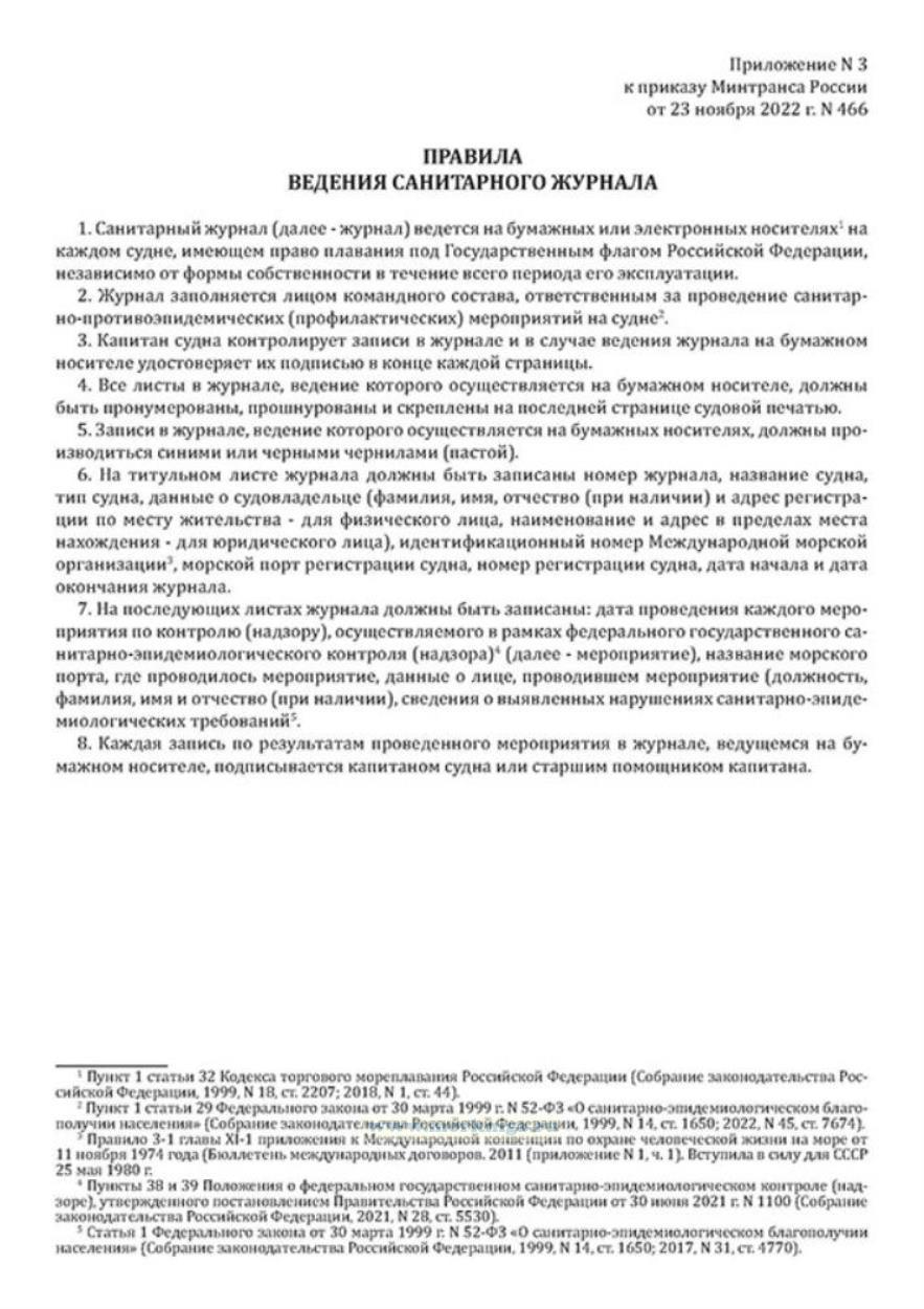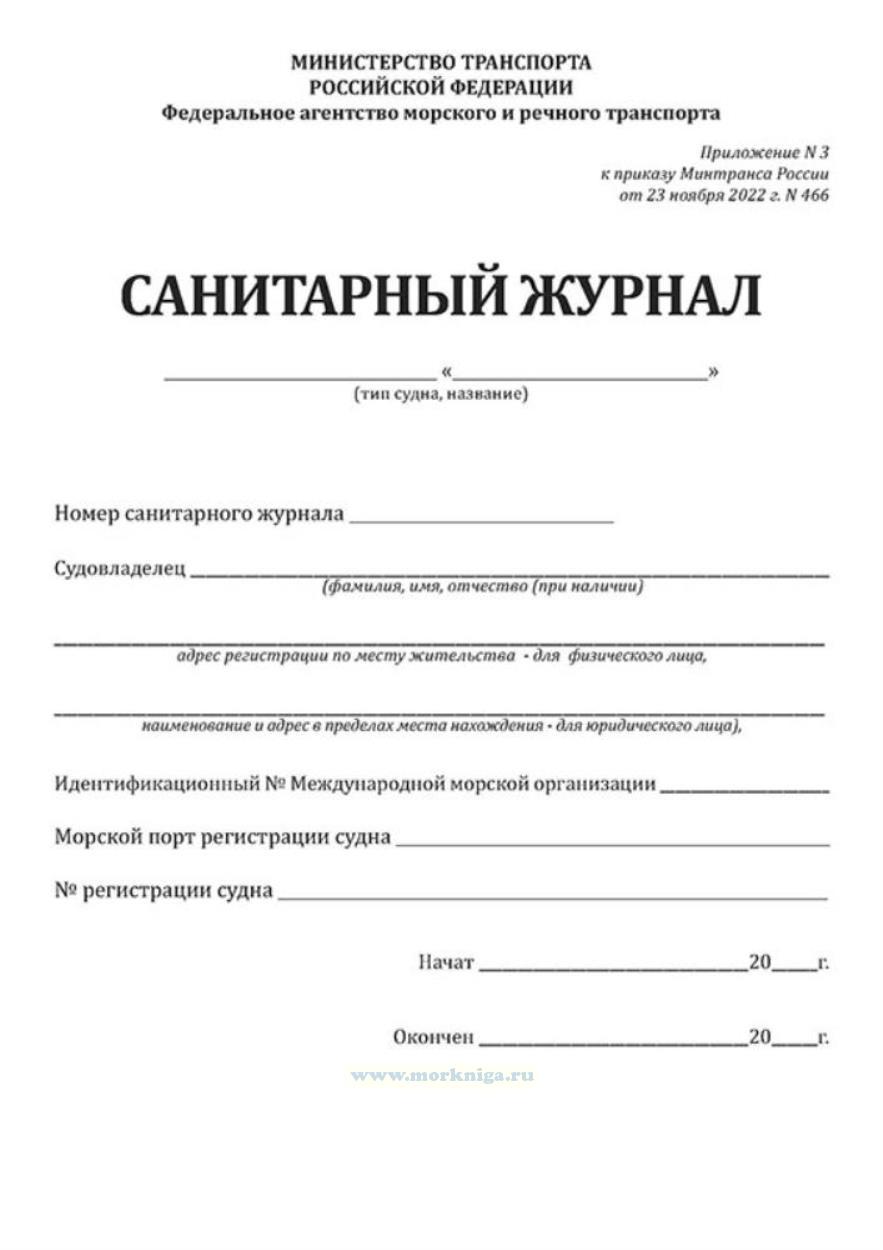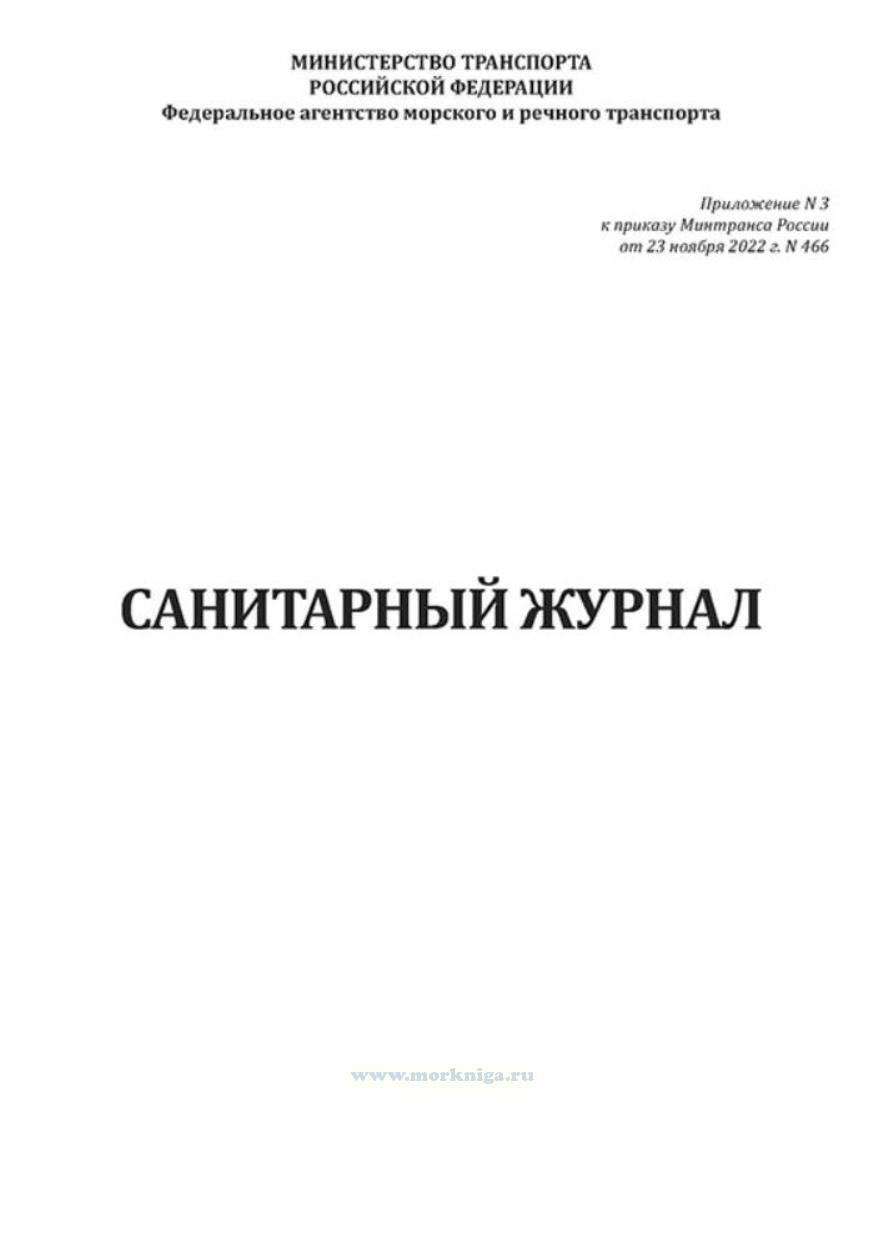 Форма Санитарного журнала утверждена Приложением N 3 к Приказу Минтранса России от 23.11.2022 N 466 "Об установлении правил ведения судовых документов"