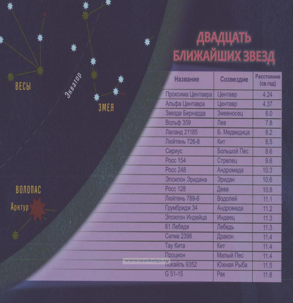 На карте Звездного неба изображен вид неба Северного и Южного полушарий, показана схема солнечной системы, перечислены двадцать самых ярких и близких звезд, дана краткая информация о каждой планете из солнечной системы.
