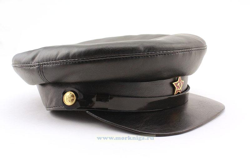Фуражка имеет расширенный черный лакированный козырек, над которым на двух малых форменных пуговицах прикреплялся так же лакированный черный раздвижной подбородный ремень, над ним прикреплена советская звезда.