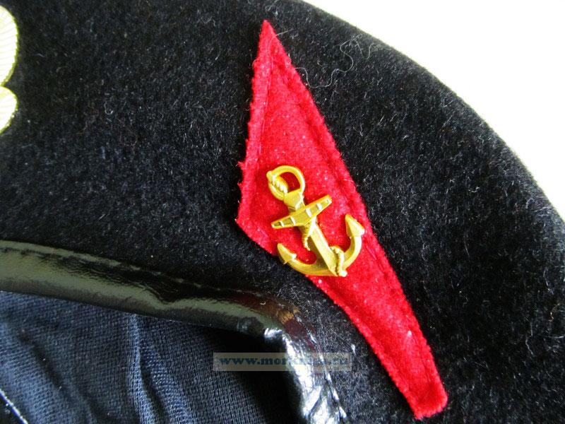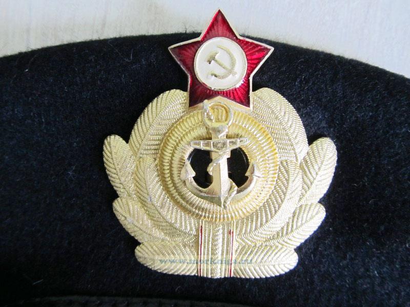 С левой стороны крепится красный флажок с золотистым якорем, спереди - офицерская кокарда ВМФ СССР.