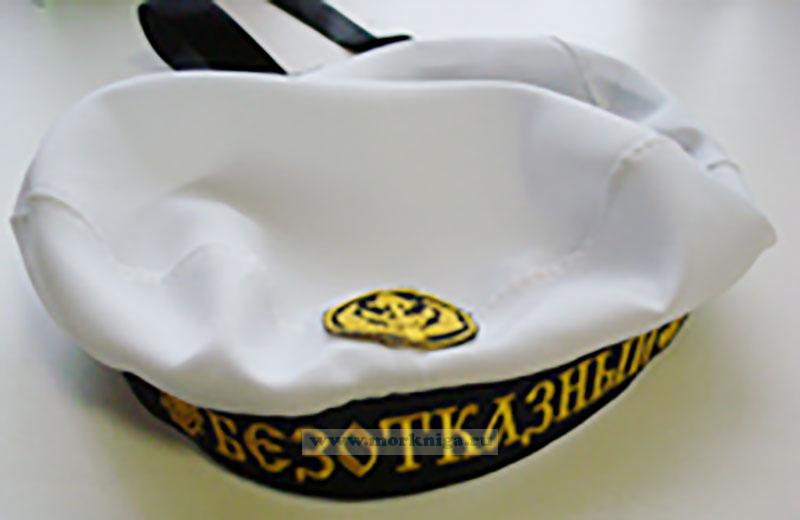 Бескозырка представлена в белом цвете. Снизу головного убора имеется черный кант с вышитой надписью "Безотказный", над кантом нашивка "краб" с листьями.
