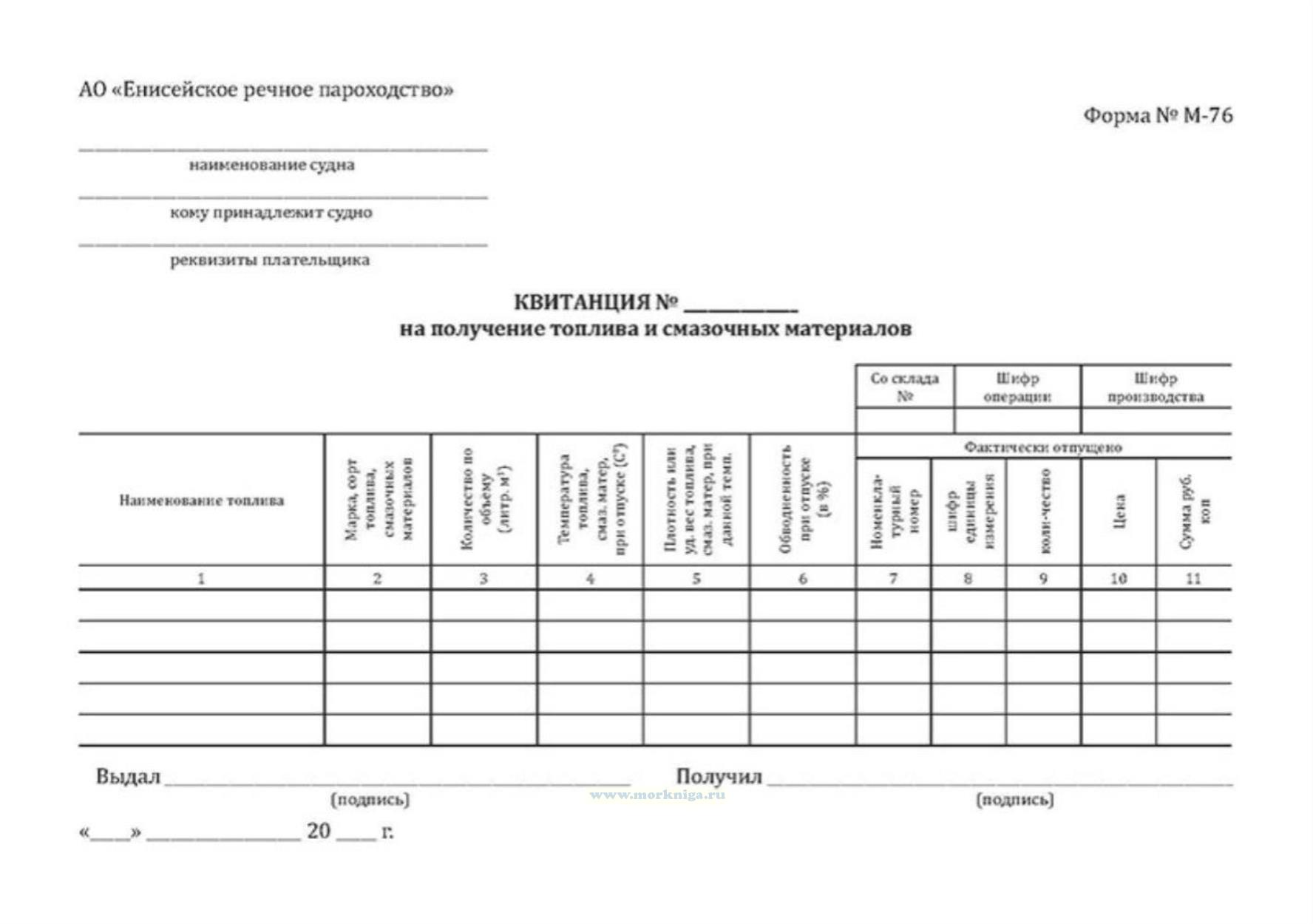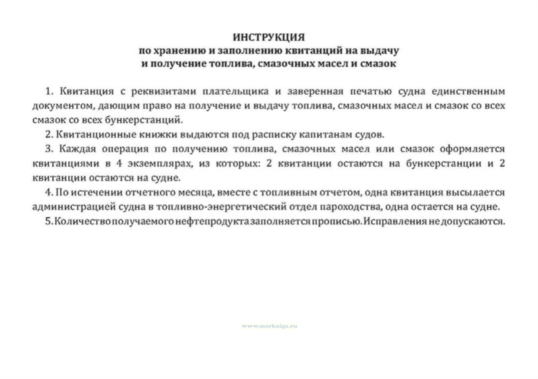 Квитанция с реквизитами плательщика и заверенная печатью судна единственным документом, дающим право на получение и выдачу топлива, смазочных масел и смазок со всех смазок со всех бункерстанций.