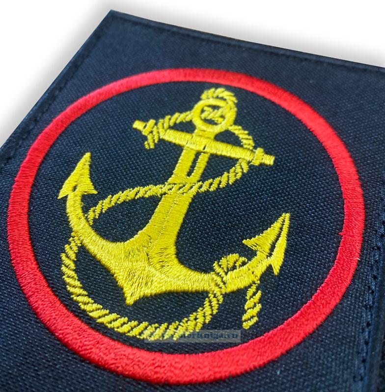Нарукавный квадратный знак Морской пехоты Якорь вышит желтой шелковой нитью, красная круглая окантовка Для создания фона использовалось сукно черного цвета Края оверлочены черной нитью