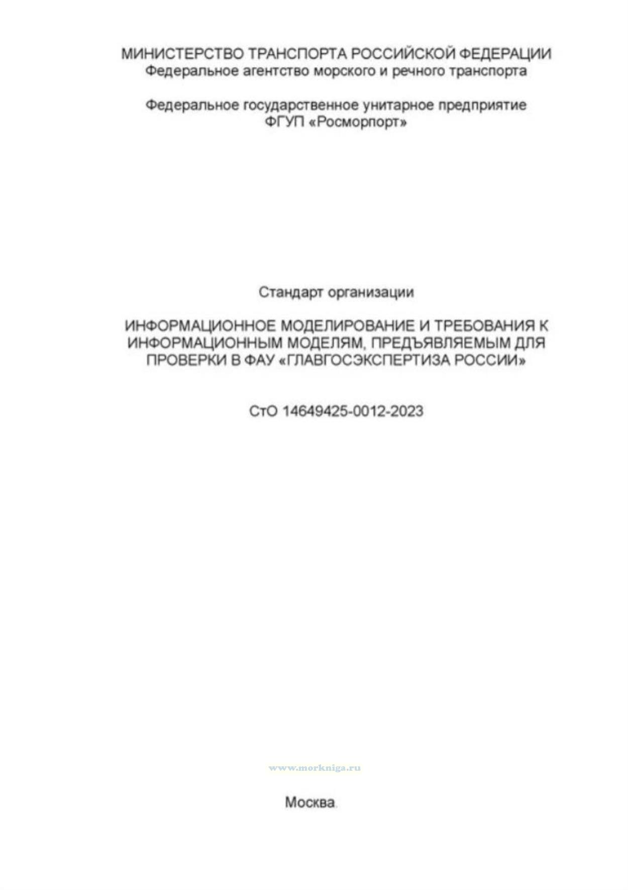 СТО 14649425-0012-2023 "Информационное моделирование и требования к информационным моделям, предъявляемым для проверки в ФАУ "Главгосэкспертиза России" утв. Приказом ФГУП "Росморпорт" от 19.04.2023 № 149.