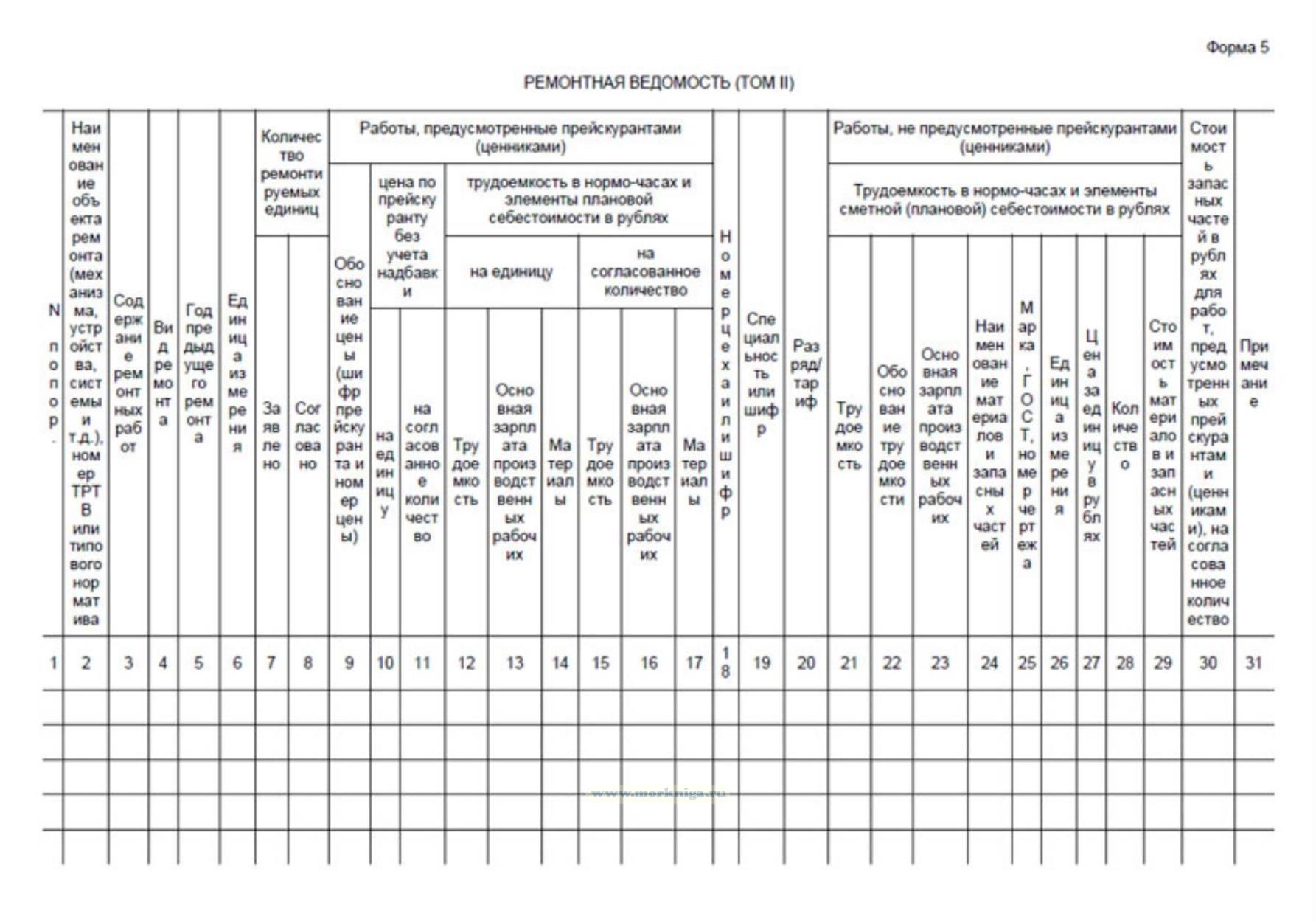Форма бланка "Ремонтная ведомость (том II) (Форма 5)" соответствует Приложению 3 к Приказу главнокомандующего ВМФ от 23.05.1973 N 195 "Положение об организации ремонта, переоборудования и модернизации боевых кораблей, вспомогательных судов и базовых плавучих средств ВМФ"