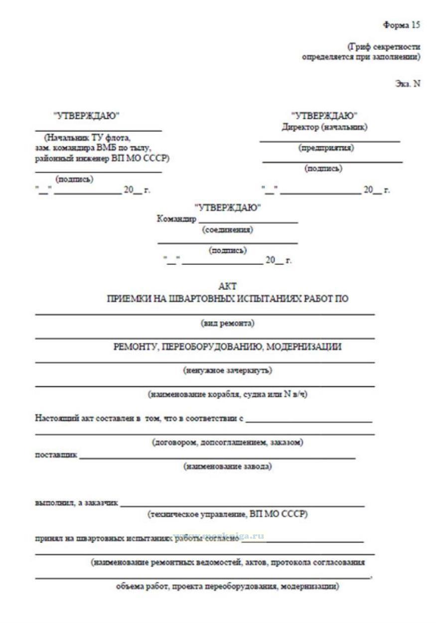 Форма бланка "Акт приемки на швартовных испытаниях работ по ремонту, переоборудованию, модернизации (форма 15)" соответствует Приложению 3 к Приказу главнокомандующего ВМФ от 23.05.1973 N 195 "Положение об организации ремонта, переоборудования и модернизации боевых кораблей, вспомогательных судов и базовых плавучих средств ВМФ"