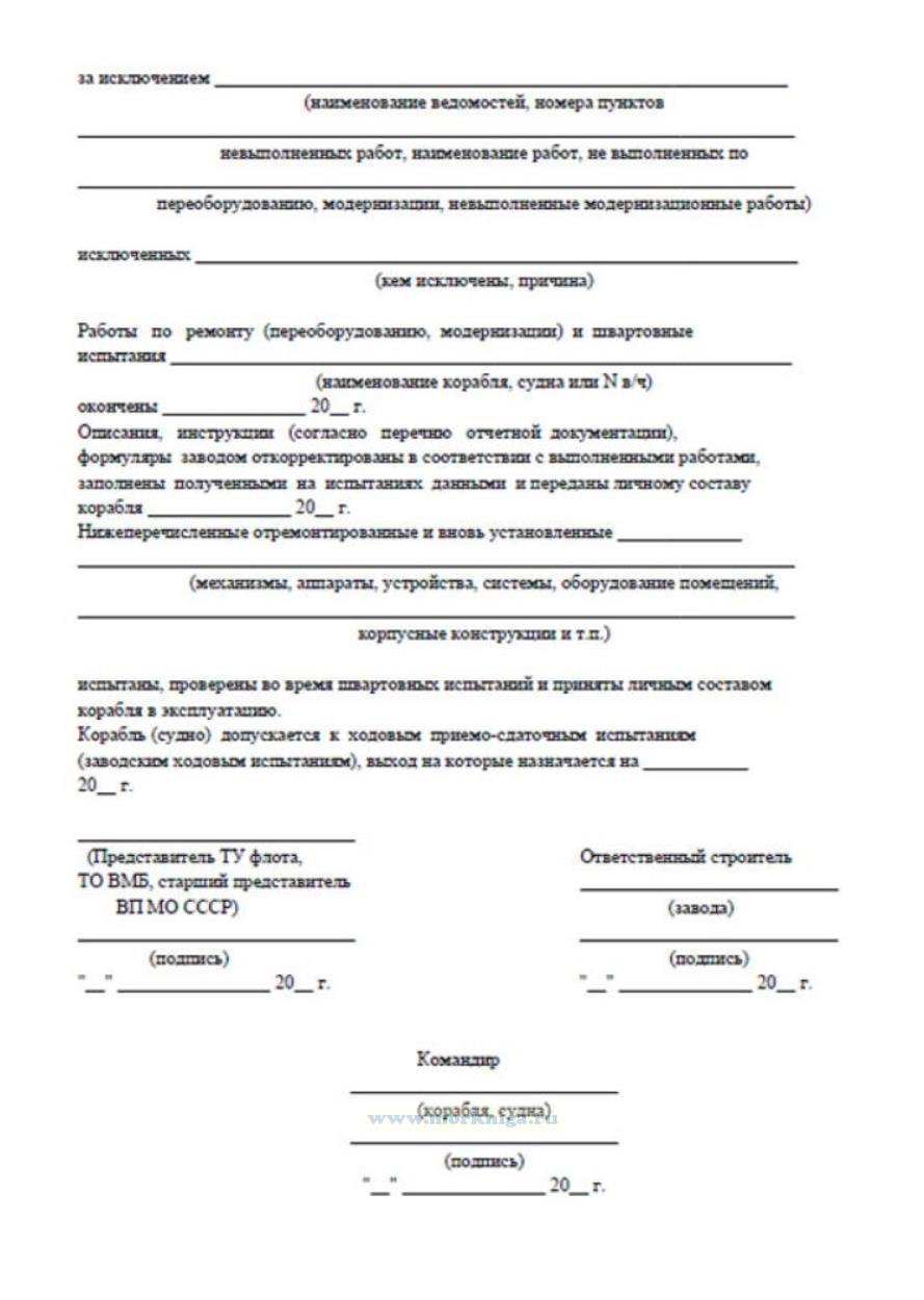 После окончания ремонта, переоборудования, модернизации корабля в целом и приемки отремонтированной, вновь установленной материальной части составляется акт по форме 15 об окончании всех работ на корабле, о приемке их на швартовных испытаниях и готовности материальной части корабля к проведению ходовых приемо-сдаточных испытаний или заводских ходовых испытаний (при приемке государственной комиссией корабля после переоборудования).