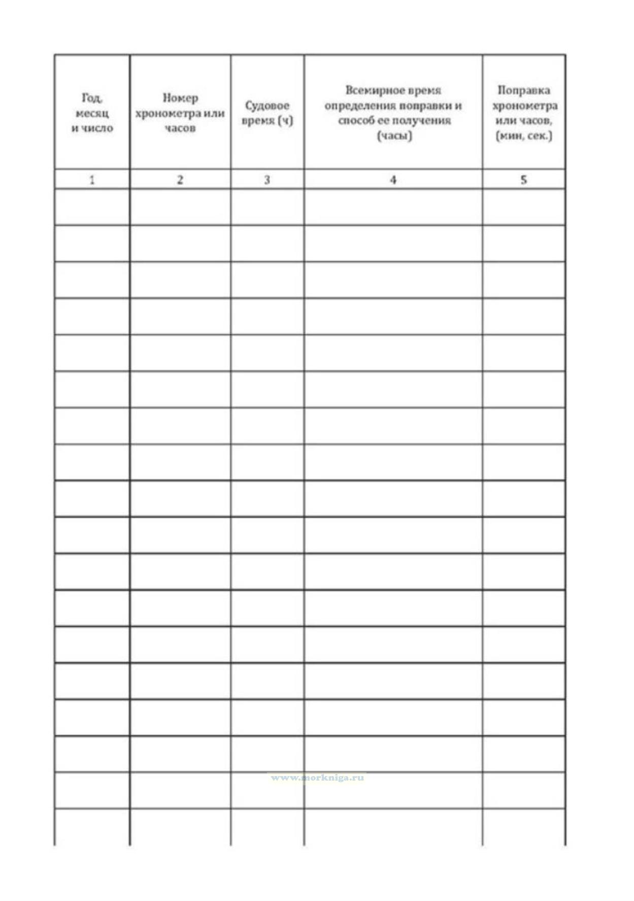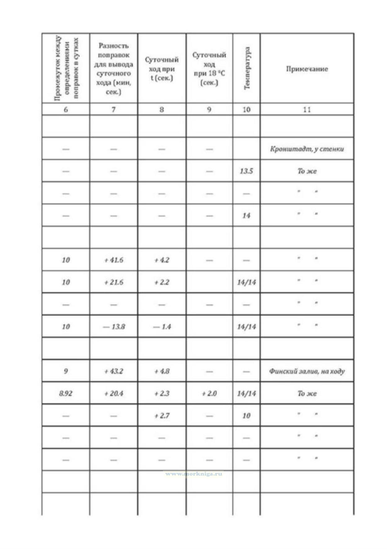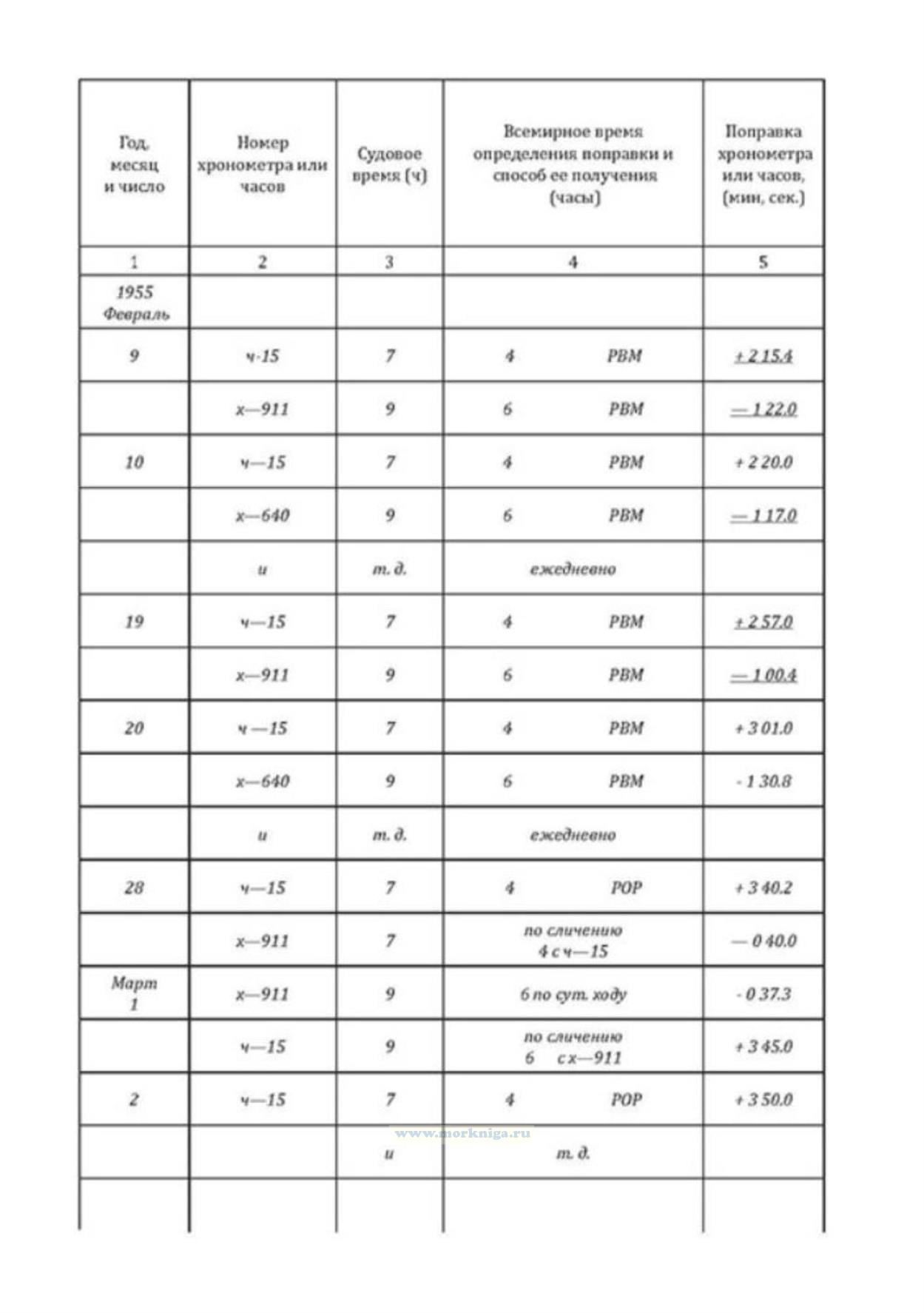 На кораблях, где имеются хронометры и часы (по которым производятся отсчеты времени при астрономических наблюдениях), должны вестись журналы по форме Ш-10М, предусматривающие запись определяемых и рассчитываемых для каждого дня поправок хронометров и часов и выводов их суточных ходов.