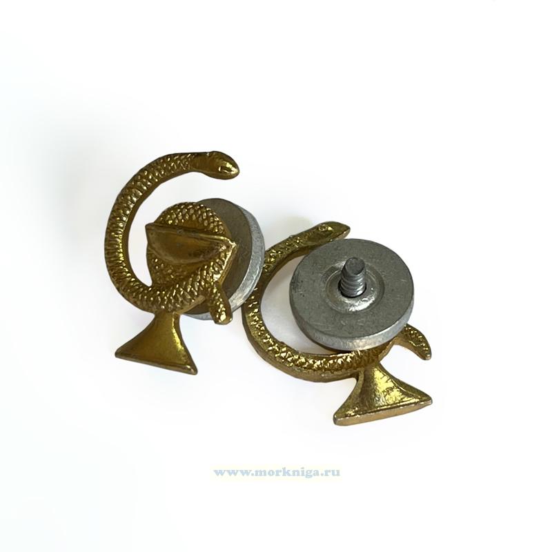 Чаша со змеей золотистого цвета - реплика петличных эмблем Военно-Медицинского состава всех родов войск Красной Армии образца 1936 года - изготовленная для военно-исторической реконструкции униформы РККА. Данные эмблемы были введены приказами НКО СССР №33 от 10.03.1936 года и №165 от 31.08.1936 года.