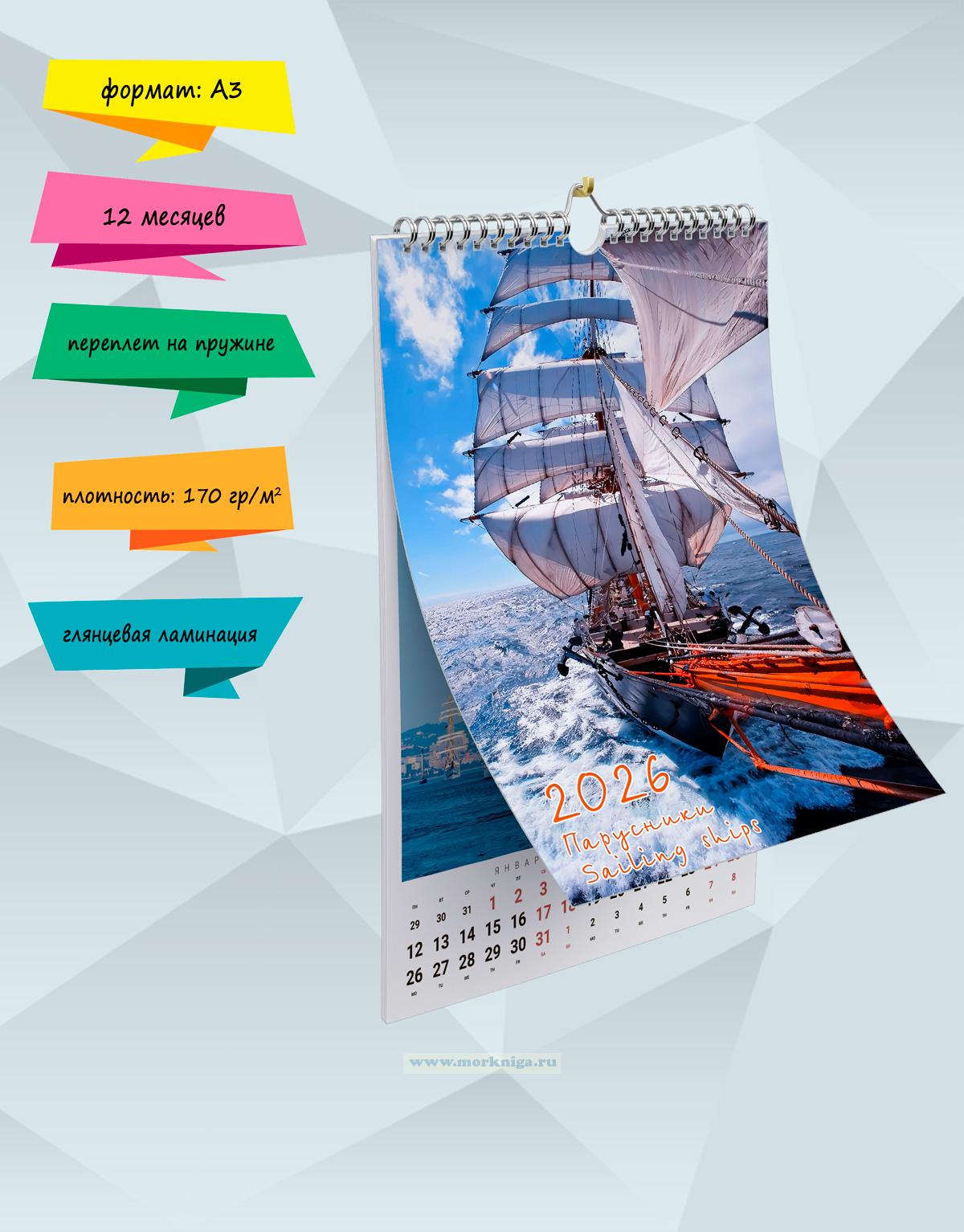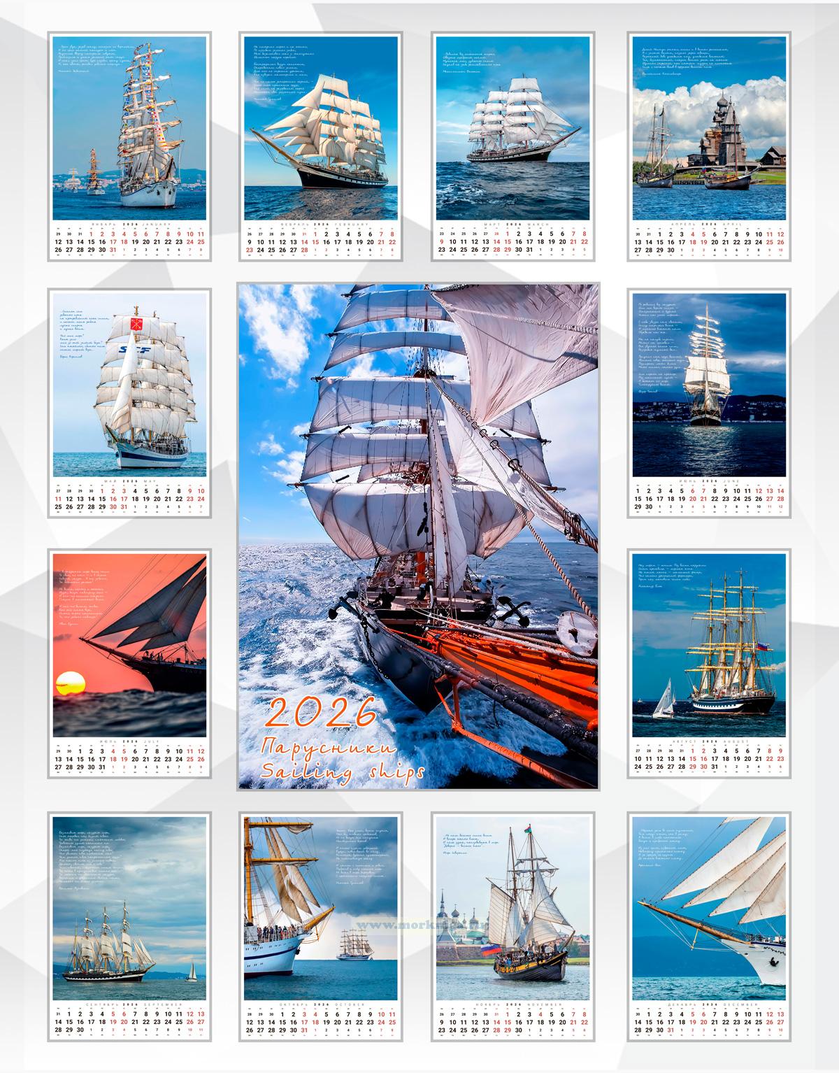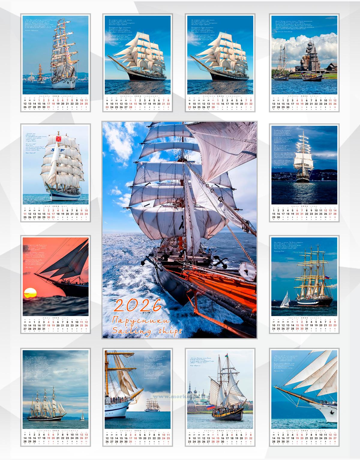 Календарь содержит 12 изображений парусников с отрывками стихотворений известных авторов, таких как: