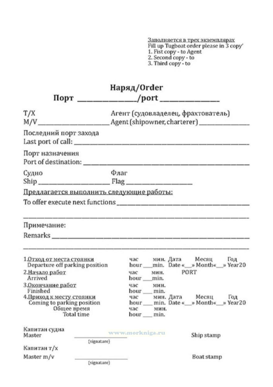 Бланк на двух языках - русском и английском. При производстве работ в порту документом производственного планирования является наряд на выполнение работ в порту. Наряд оформляется на каждый объект работы (судно).