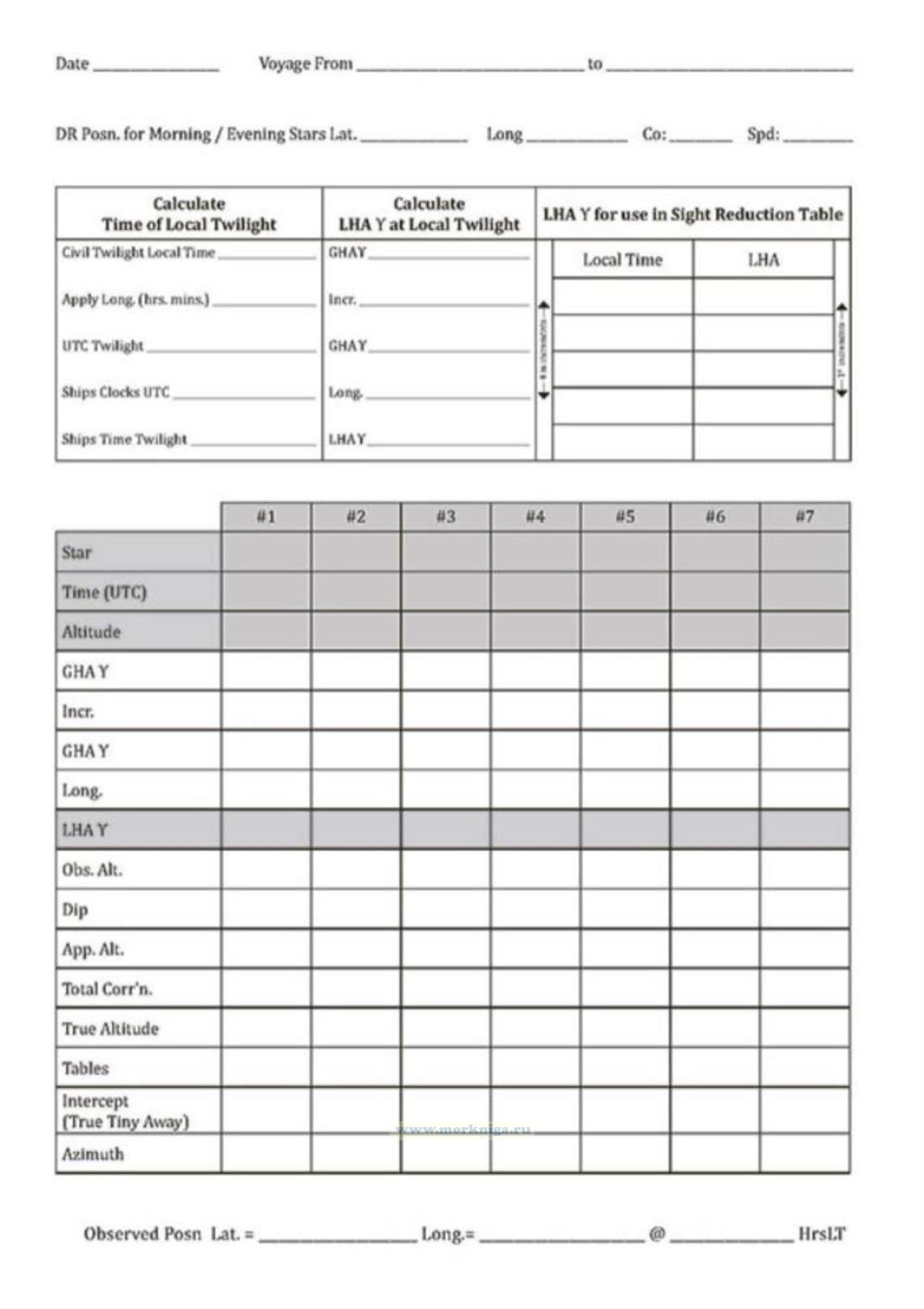 The sight reduction method logbook, with tabulated pages for recording the observations of both morning and evening stars.