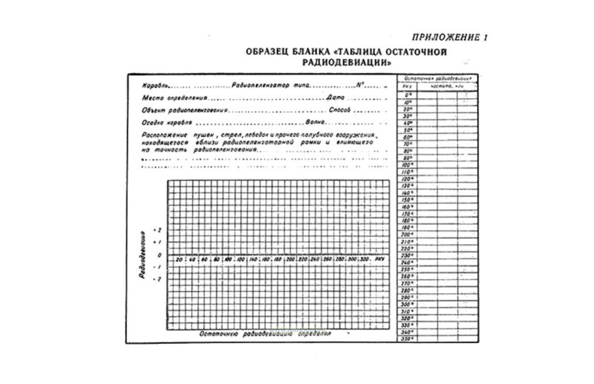Форма бланка "Таблица остаточной радиодевиации" соответствует Приложению 1 к Правилам штурманской службы №32. Компенсация и определение радиодевиации, которые утратили силу.