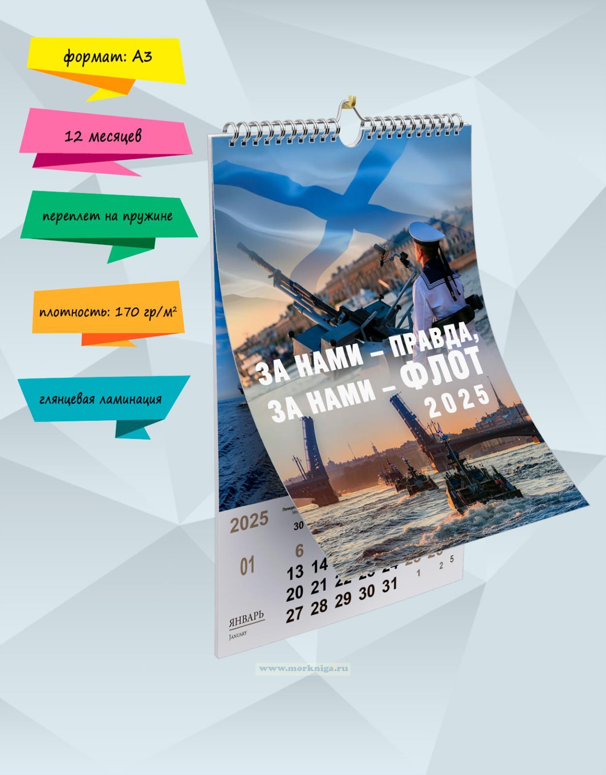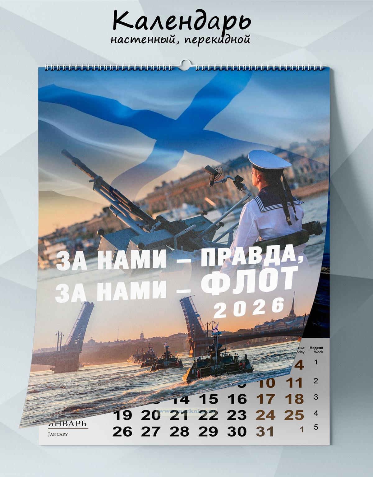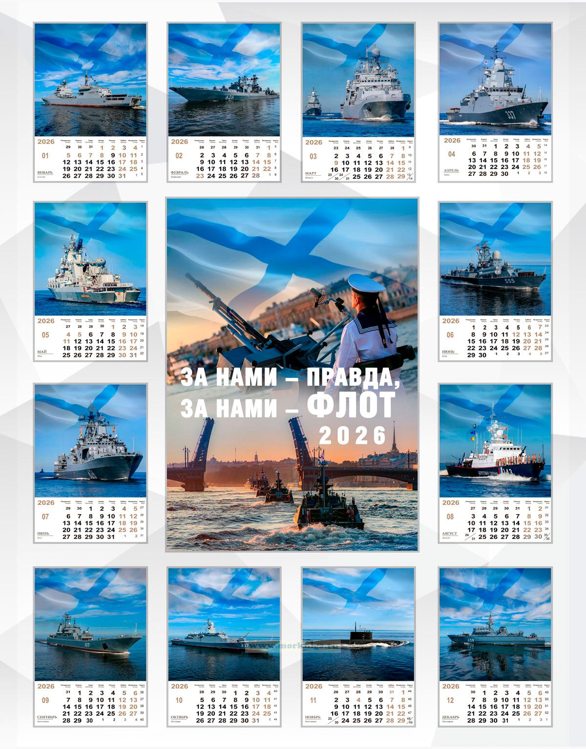Календарь "За нами - правда, за нами - флот" содержит 12 изображений судов Военно-морского флота Российской Федерации.