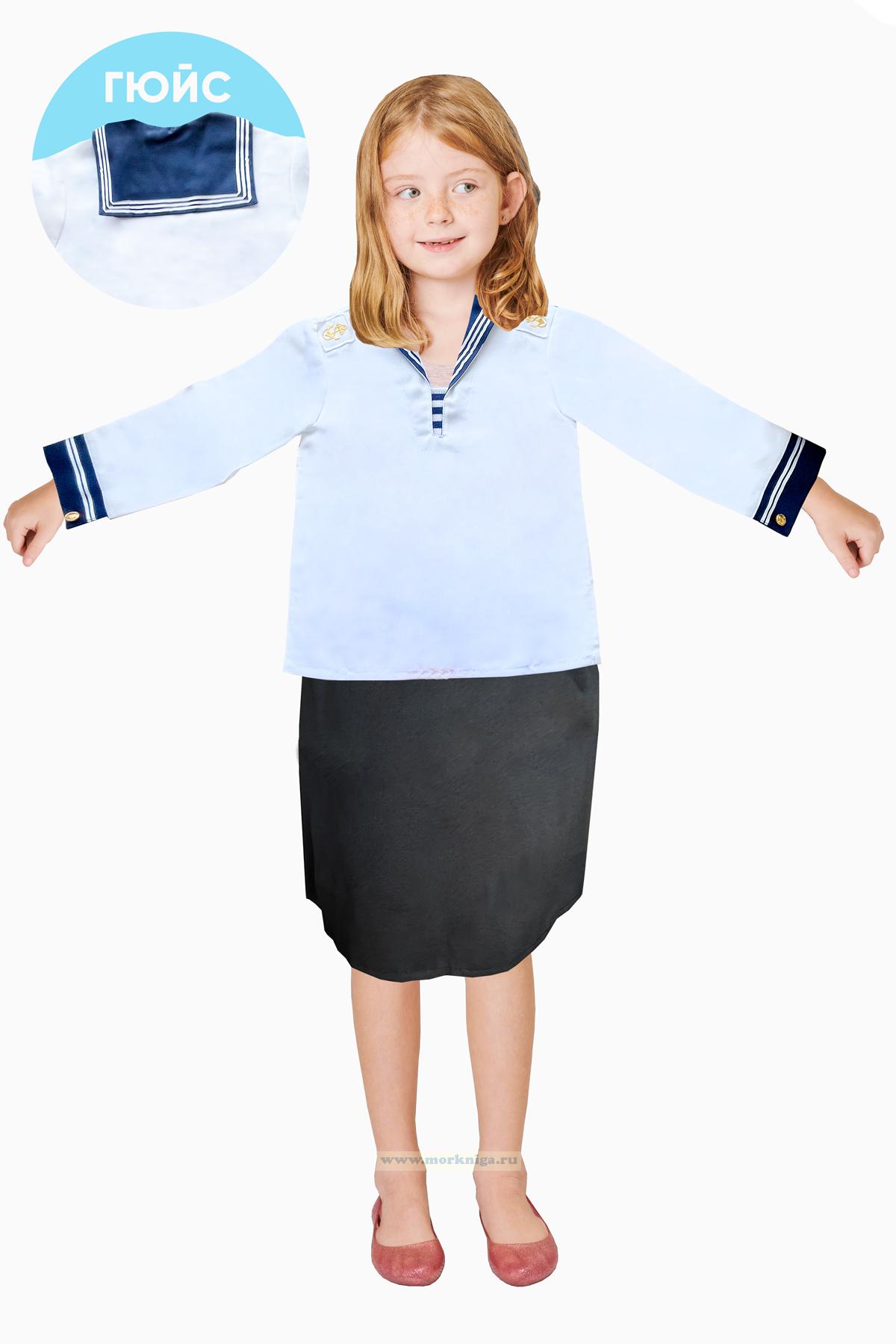 Костюм состоит из двух частей: рубашка с пришитым гюйсом и вставкой-обманкой "тельняшка"; юбка.