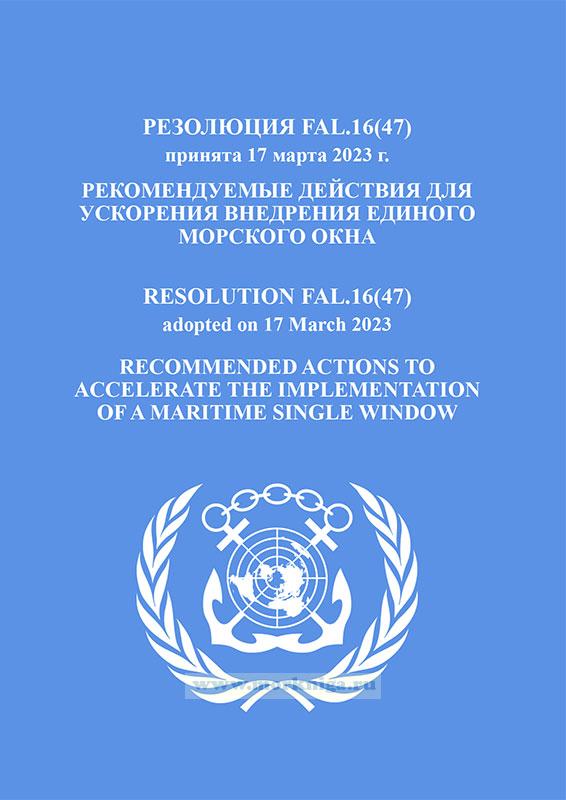 Резолюция FAL.16(47) "Рекомендуемые действия для ускорения внедрения единого морского окна" включена в Сборник № 73 резолюций ИМО/Collection No.73 of IMO Resolutions.