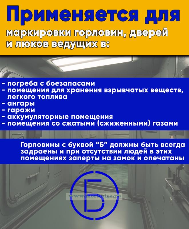 Трафарет применяется для маркировки горловин, дверей и люков, ведущих в погреба с боезапасами, в помещения для хранения взрывчатых веществ, легкого топлива, ангары, гаражи, аккумуляторные помещения, помещения со сжатыми (сжиженными) газами. Горловины с буквой "Б" должны быть всегда задраены и при отсутствии людей в этих помещениях заперты на замок и опечатаны. Цвет букв и колец темно-синий