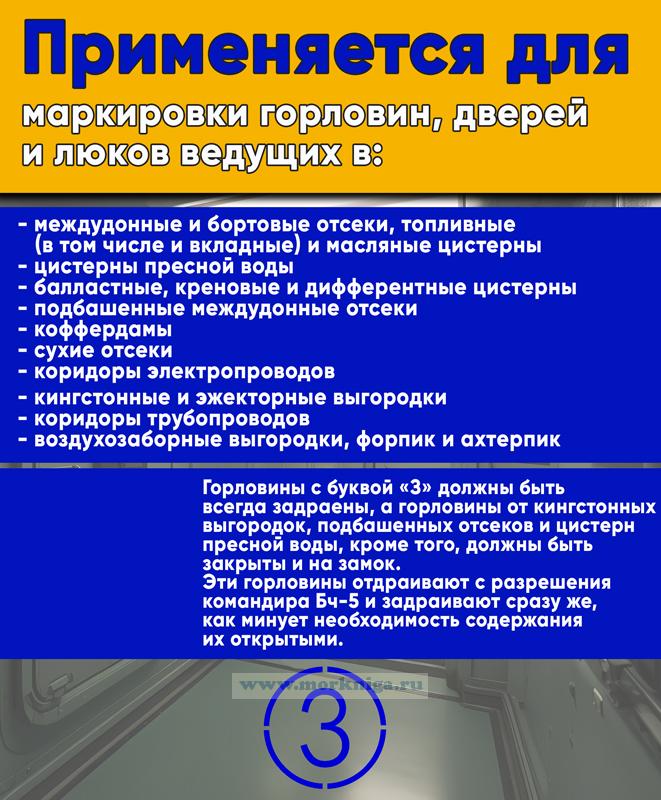 Трафарет применяется для маркировки горловин, дверей и люков ведущих в междудонные и бортовые отсеки, топливные (в том числе и вкладные) и масляные цистерны, цистерны пресной воды, балластные, креновые и дифферентные цистерны, подбашенные междудонные отсеки. коффердамы, сухие отсеки, коридоры электропроводов, кингстонные и эжекторные выгородки, коридоры трубопроводов, воздухозаборные выгородки, форпик и ахтерпик. Цвет букв и колец темно-синий.