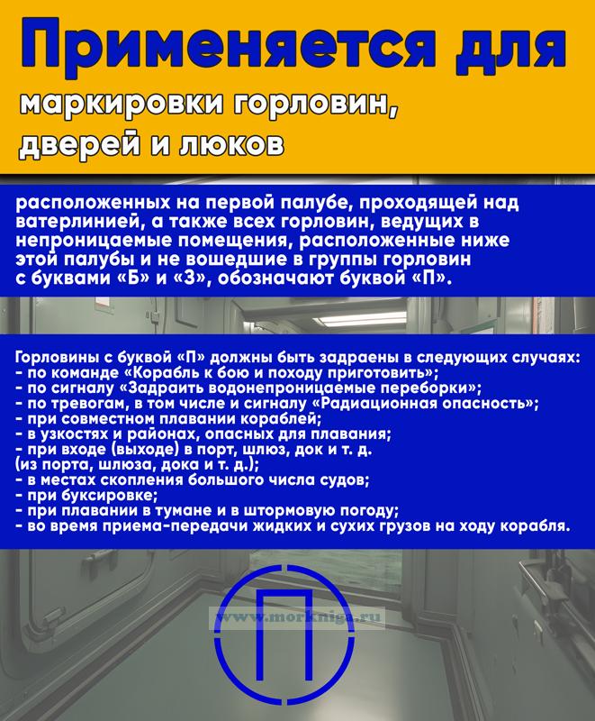 Трафарет применяется для маркировки горловин, дверей и люков, расположенных на первой палубе, проходящей над ватерлинией, а также всех горловин, ведущих в непроницаемые помещения, расположенные ниже этой палубы и не вошедшие в группы горловин с буквами "Б" и "З", обозначают буквой "П". Цвет букв и колец темно-синий.
