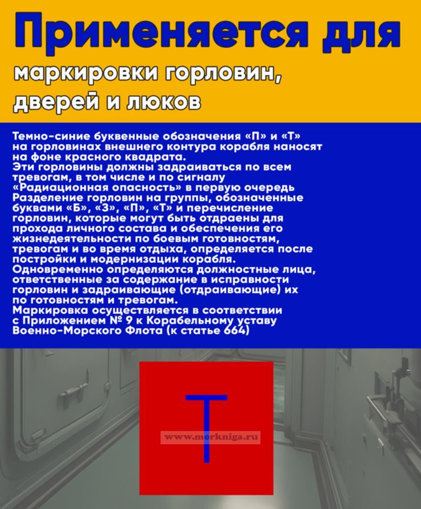 Применяется для маркировки горловин, дверей и люков, расположенных выше первой палубы, проходящей над ватерлинией, и вошедших в группу горловин с буквами "Б" и "З", а также горловин, ведущих в герметичные помещения, расположенных ниже этой палубы, обозначают буквой "Т". Цвет букв и колец темно-синий.