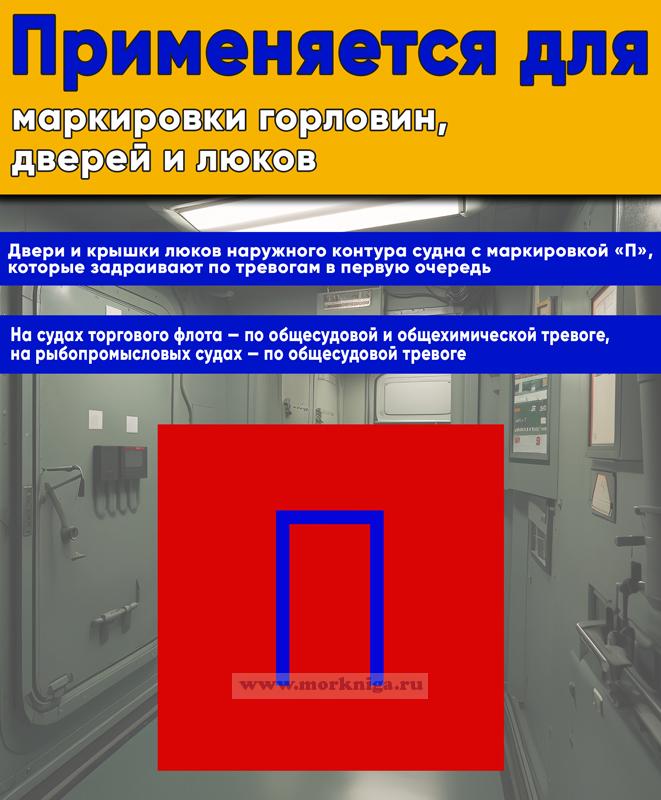 Трафарет применяется для маркировки горловин, дверей и люков наружного контура судна маркировкой «П», которые задраивают по тревогам в первую очередь. Синяя буква на фоне красного квадрата